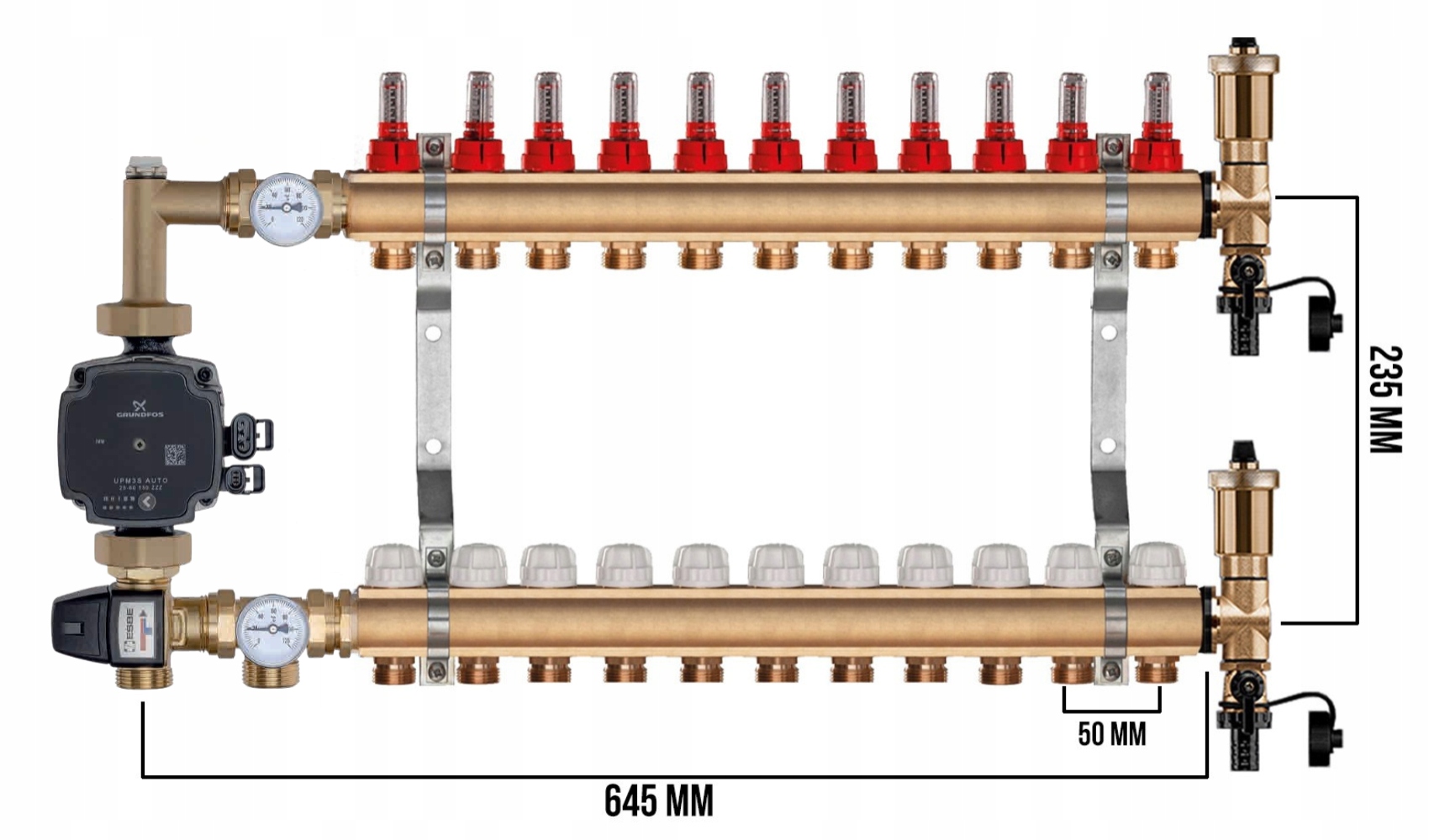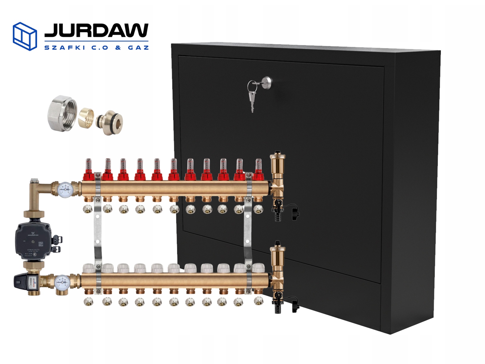 KOMPLETNY ROZDZIELACZ MOSIĘŻNY 11 SEKCJE Z GRUPĄ POMPOWĄ GRUNDFOS + ZŁĄCZKI PEX + SKRZYNKA NATYNKOWA CZARNA - POLSKI PRODUCENT