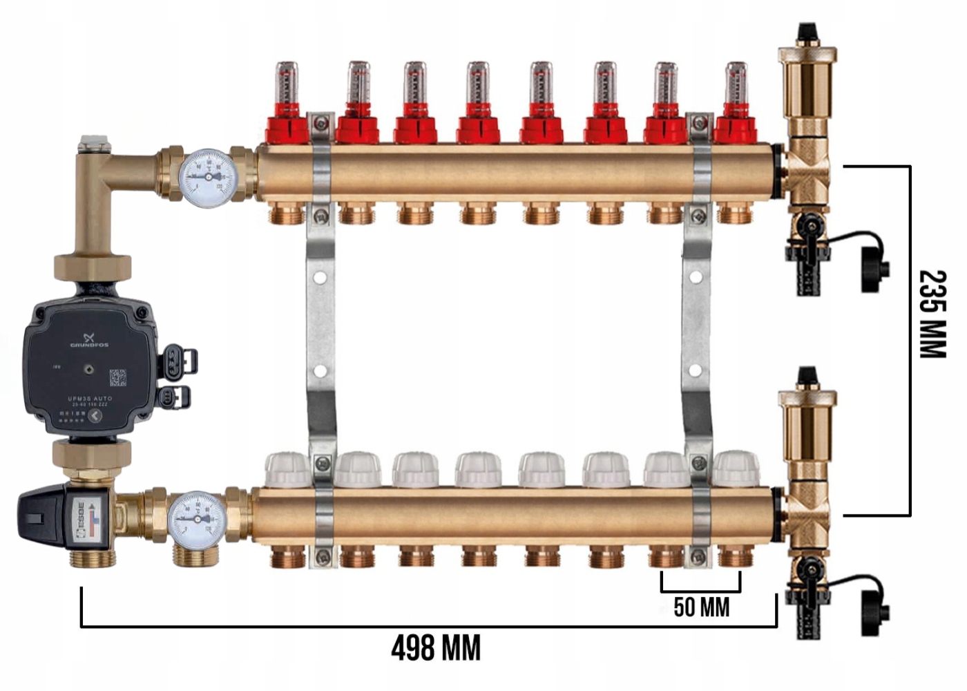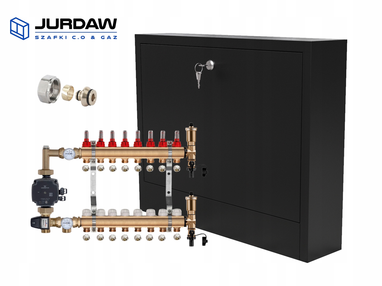 KOMPLETNY ROZDZIELACZ MOSIĘŻNY 8 SEKCJE Z GRUPĄ POMPOWĄ GRUNDFOS + ZŁĄCZKI PEX + SKRZYNKA NATYNKOWA CZARNA - POLSKI PRODUCENT