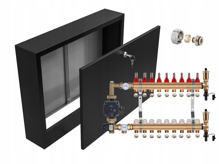 ROZDZIELACZ MOSIĘŻNY 9 Z POMPĄ GRUNDFOS + SKRZYNKA NATYNKOWA CZARNA + PEX