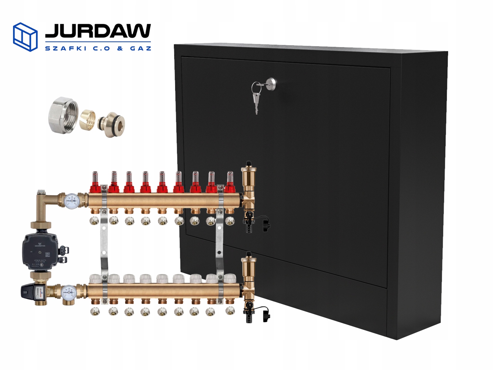 KOMPLETNY ROZDZIELACZ MOSIĘŻNY 9 SEKCJE Z GRUPĄ POMPOWĄ GRUNDFOS + ZŁĄCZKI PEX + SKRZYNKA NATYNKOWA CZARNA - POLSKI PRODUCENT