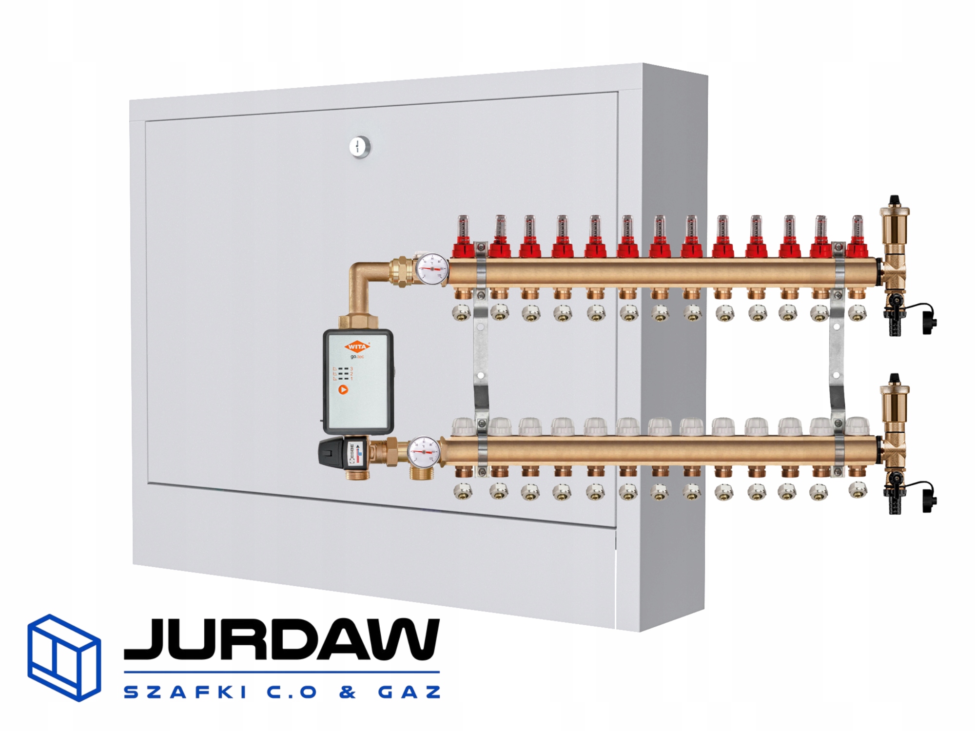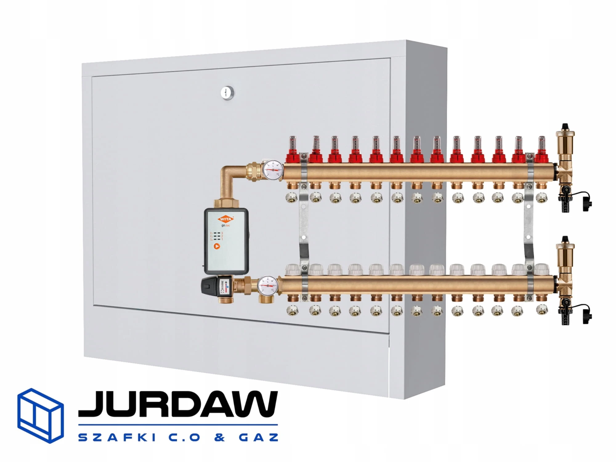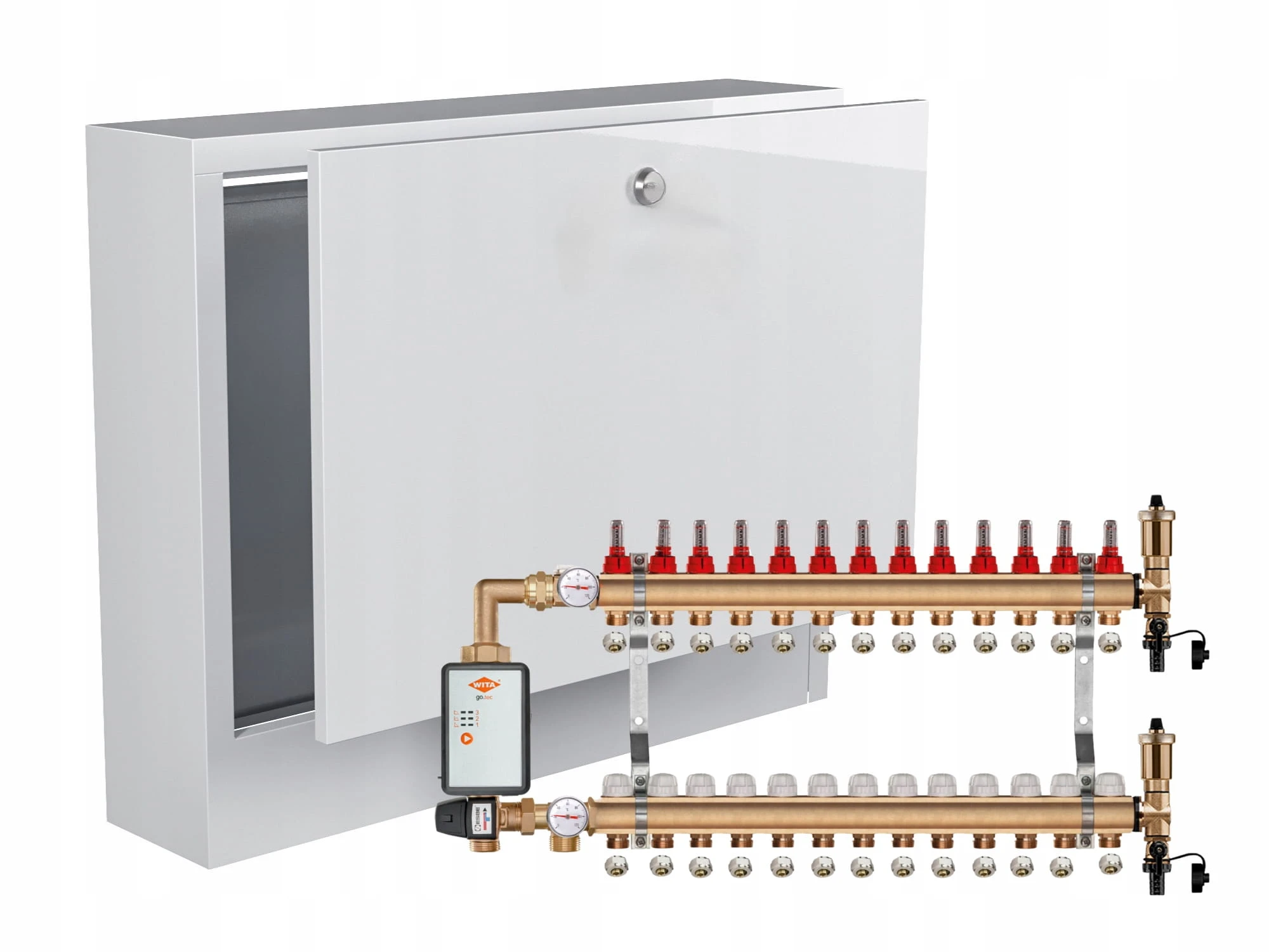KOMPLETNY ROZDZIELACZ MOSIĘŻNY 13 SEKCJE Z GRUPĄ POMPOWĄ WITA GO.TEC 60 + ZŁĄCZKI PEX + SKRZYNKA NATYNKOWA - POLSKI PRODUCENT