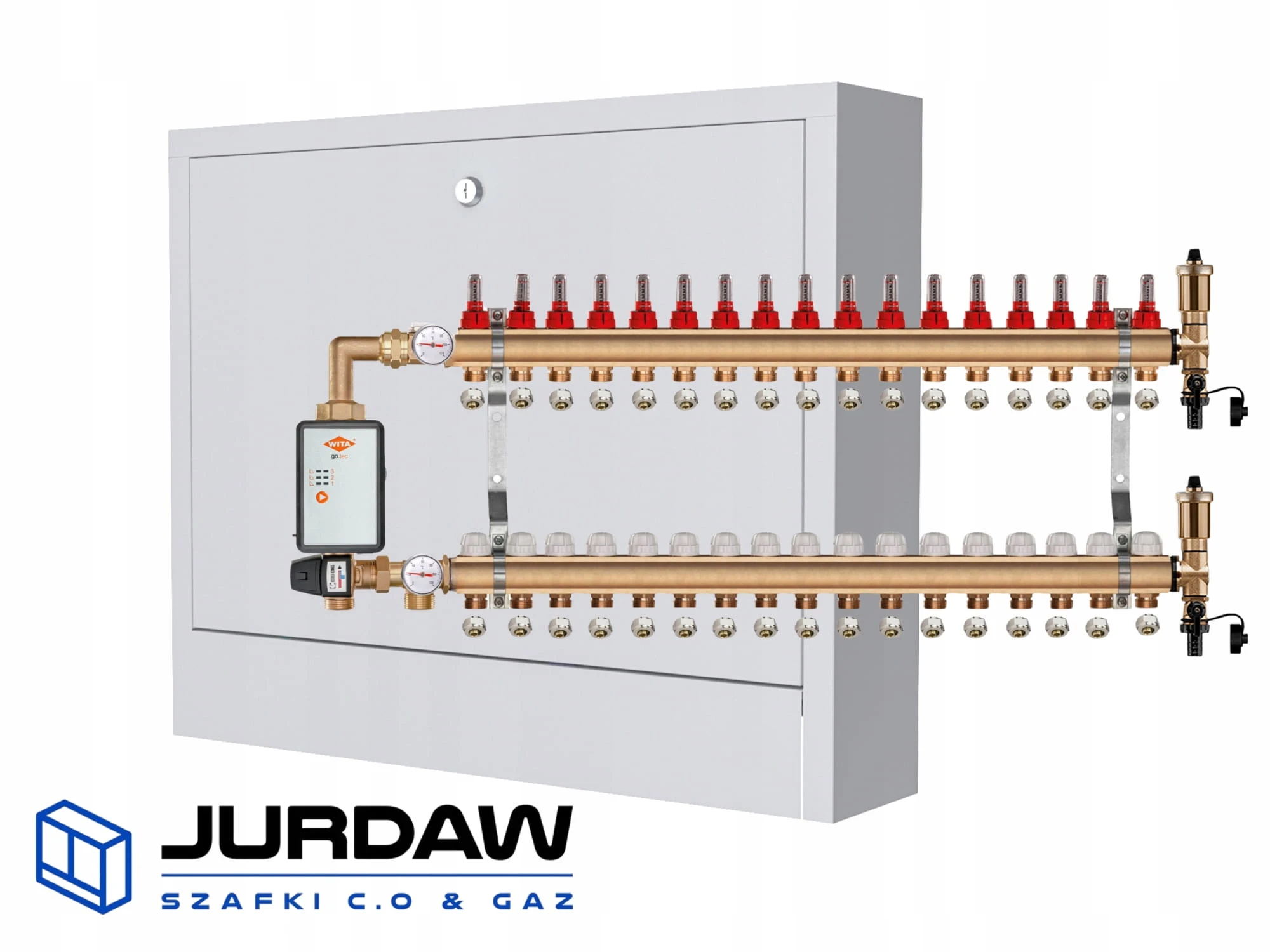KOMPLETNY ROZDZIELACZ MOSIĘŻNY 17 SEKCJE Z GRUPĄ POMPOWĄ WITA GO.TEC 60 + ZŁĄCZKI PEX + SKRZYNKA NATYNKOWA - POLSKI PRODUCENT