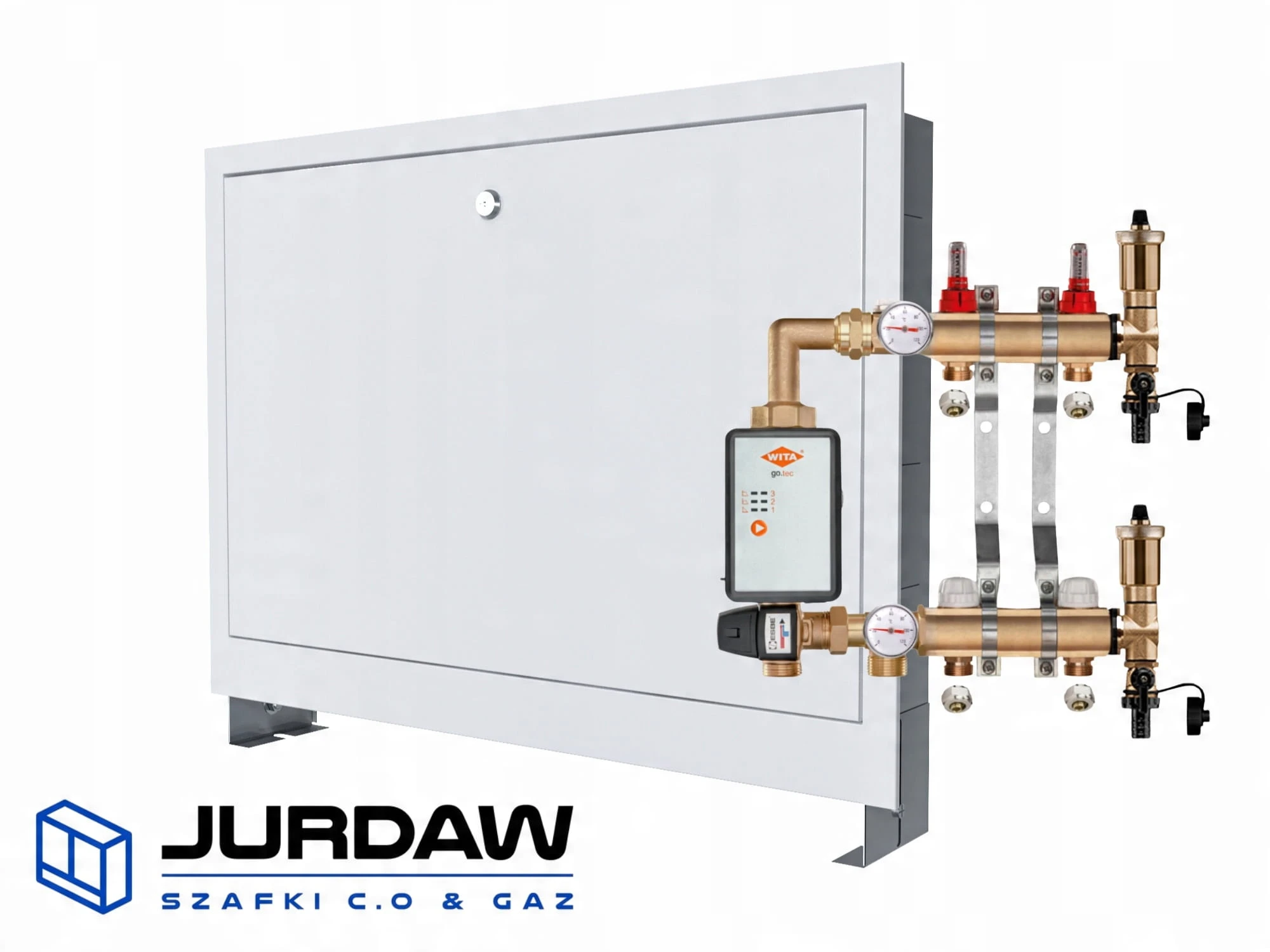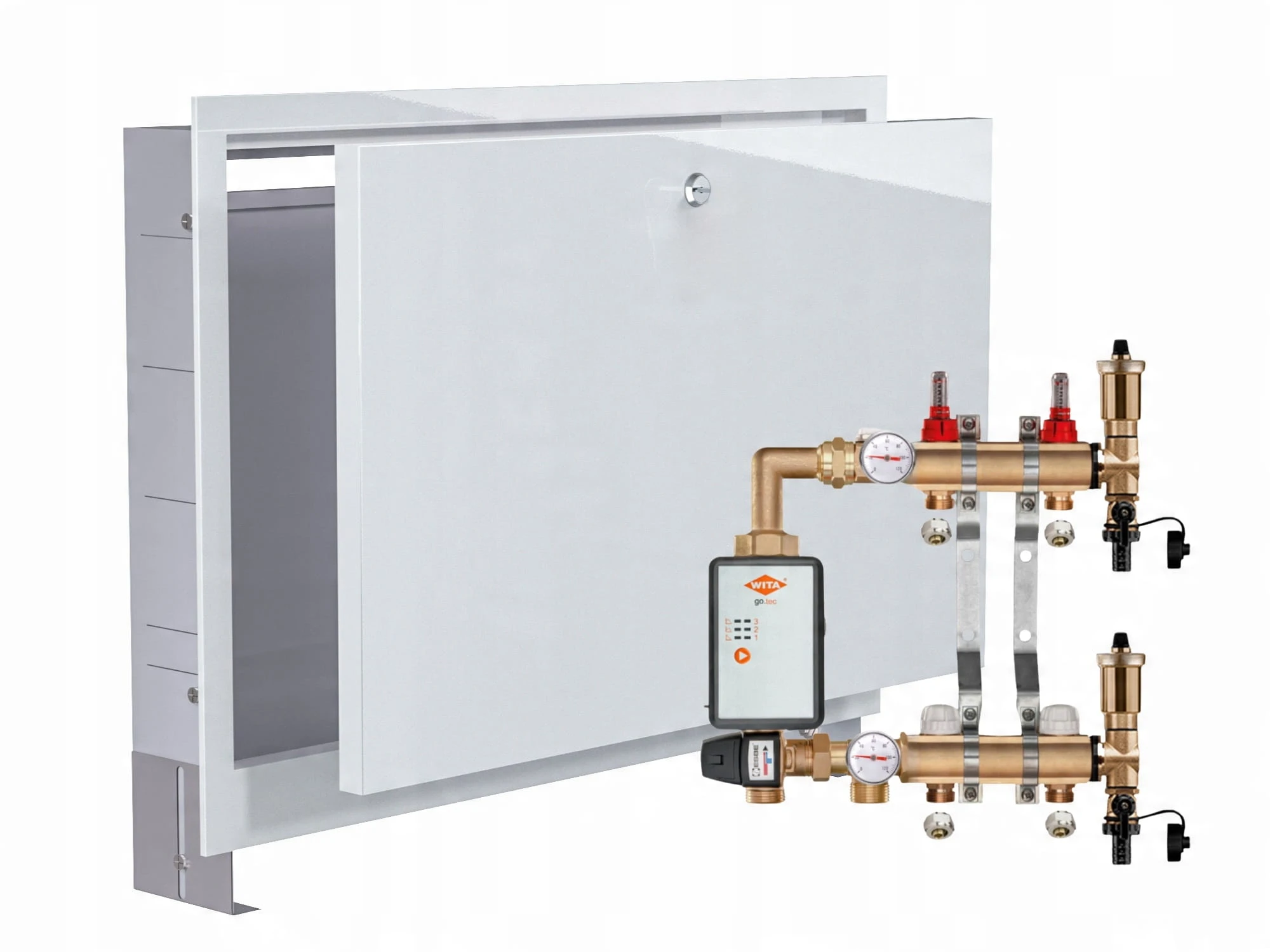 KOMPLETNY ROZDZIELACZ MOSIĘŻNY 2 SEKCJE Z GRUPĄ POMPOWĄ WITA GO.TEC 60 + ZŁĄCZKI PEX + SKRZYNKA PODTYNKOWA - POLSKI PRODUCENT