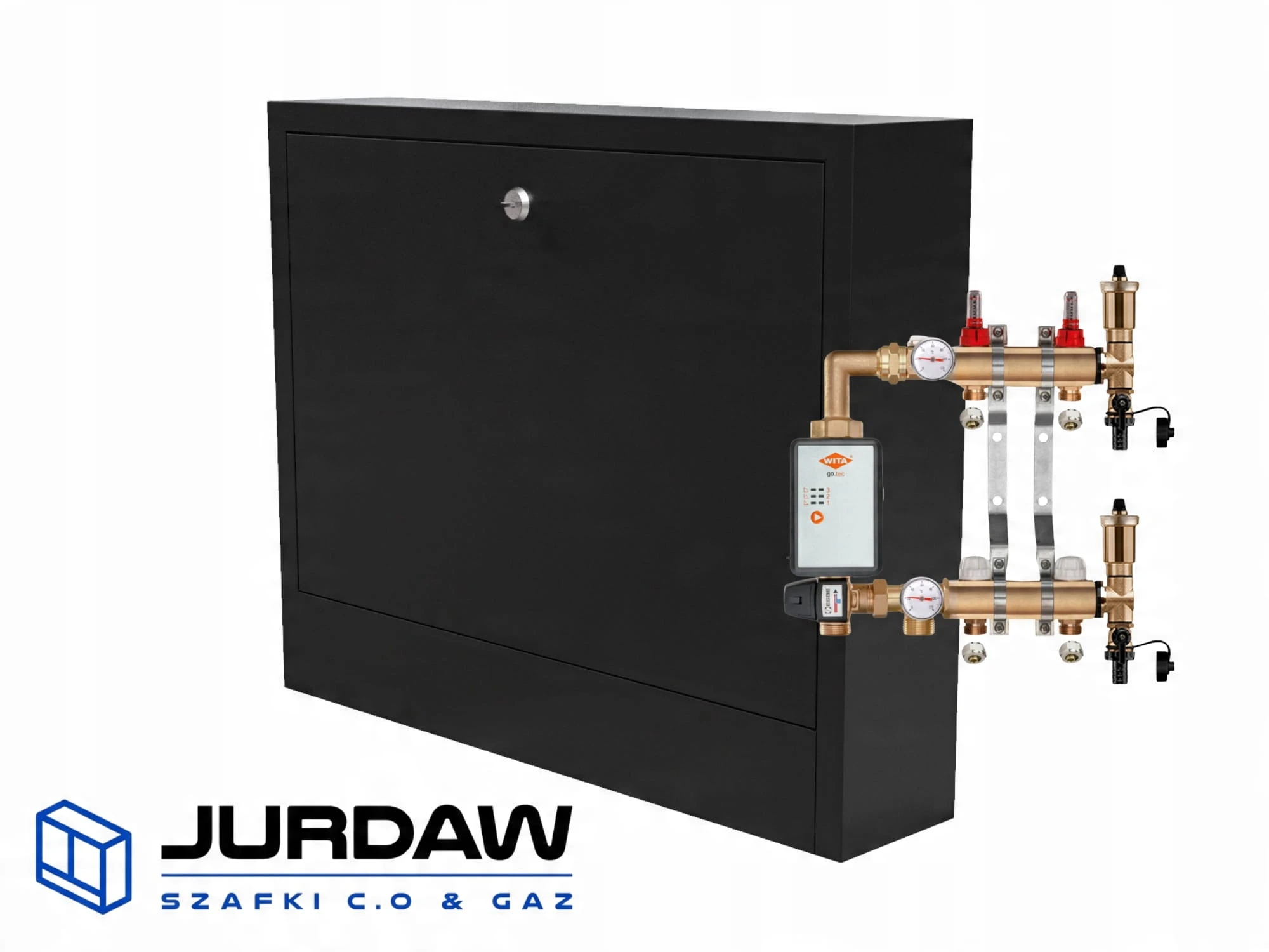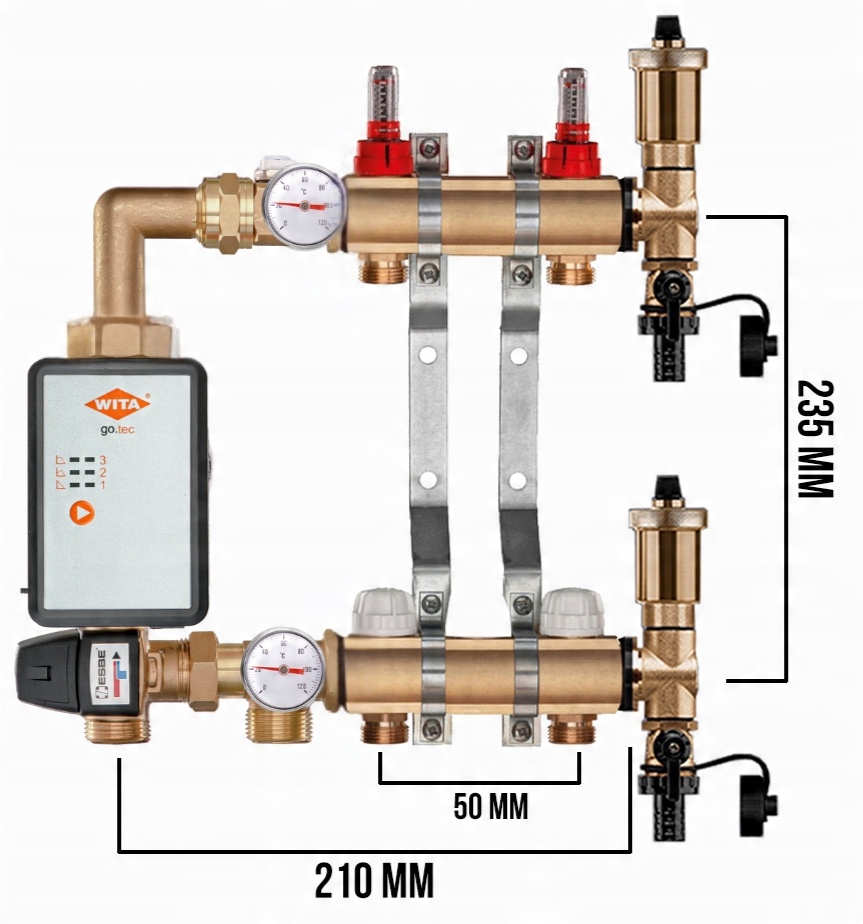 KOMPLETNY ROZDZIELACZ MOSIĘŻNY 2 SEKCJE Z GRUPĄ POMPOWĄ WITA GO.TEC 60 + ZŁĄCZKI PEX + SKRZYNKA PODTYNKOWA - POLSKI PRODUCENT