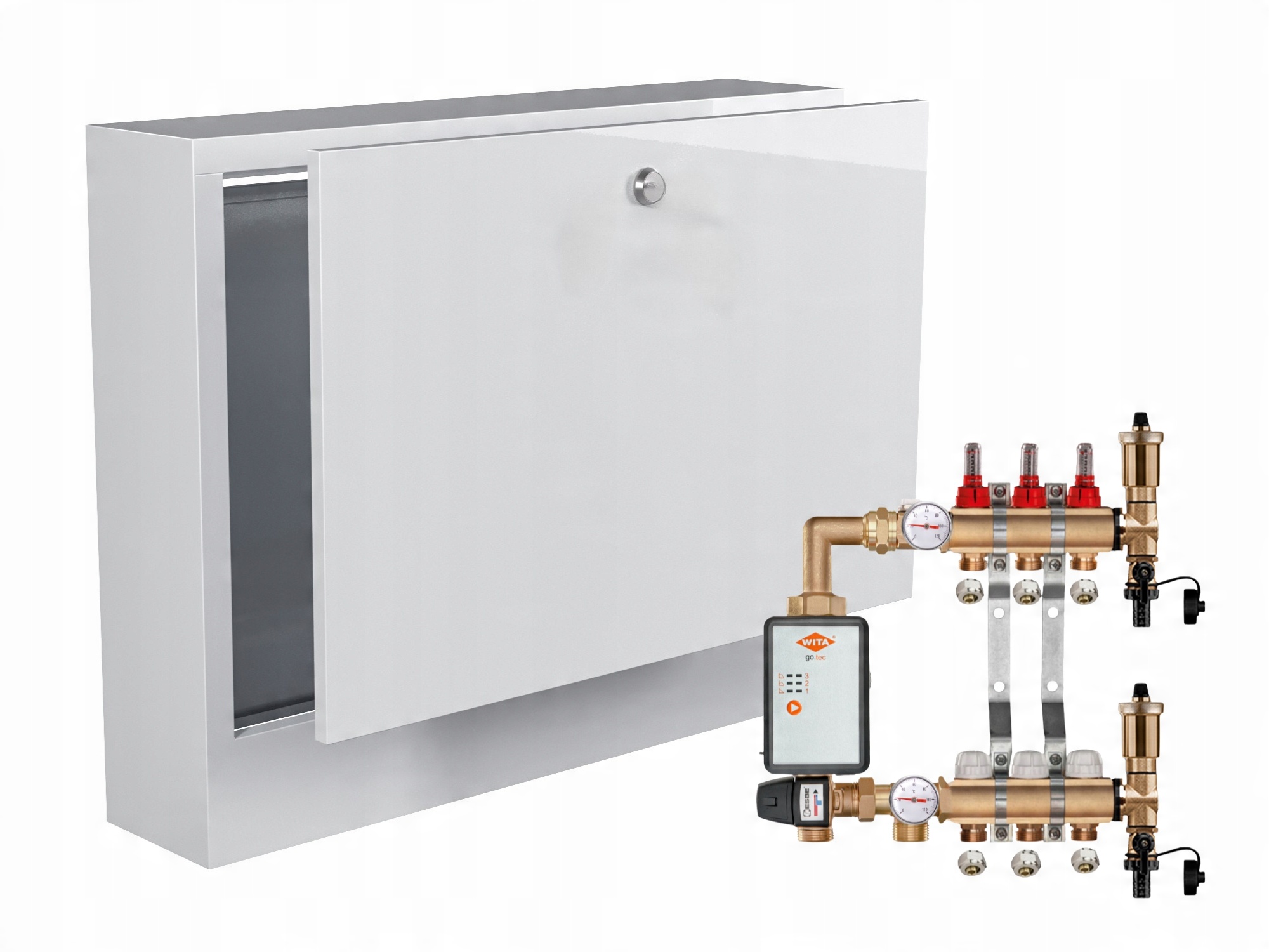 KOMPLETNY ROZDZIELACZ MOSIĘŻNY 3 SEKCJE Z GRUPĄ POMPOWĄ WITA GO.TEC 60 + ZŁĄCZKI PEX + SKRZYNKA PODTYNKOWA - POLSKI PRODUCENT