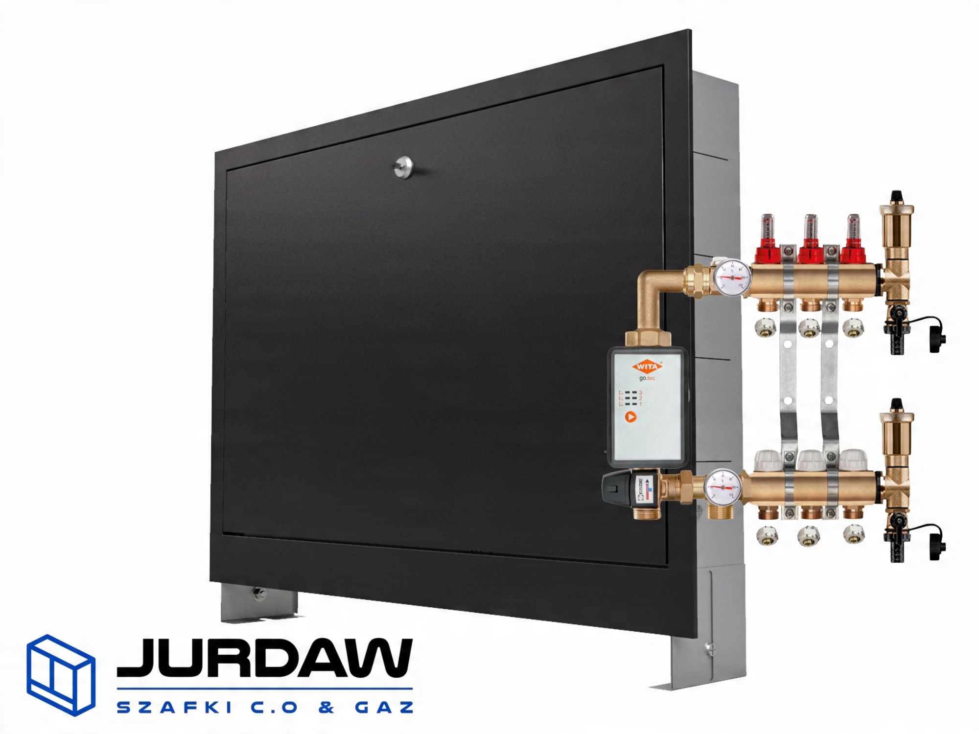 KOMPLETNY ROZDZIELACZ MOSIĘŻNY 3 SEKCJE Z GRUPĄ POMPOWĄ WITA GO.TEC 60 + ZŁĄCZKI PEX + SKRZYNKA PODTYNKOWA CZARNA - POLSKI PRODUCENT