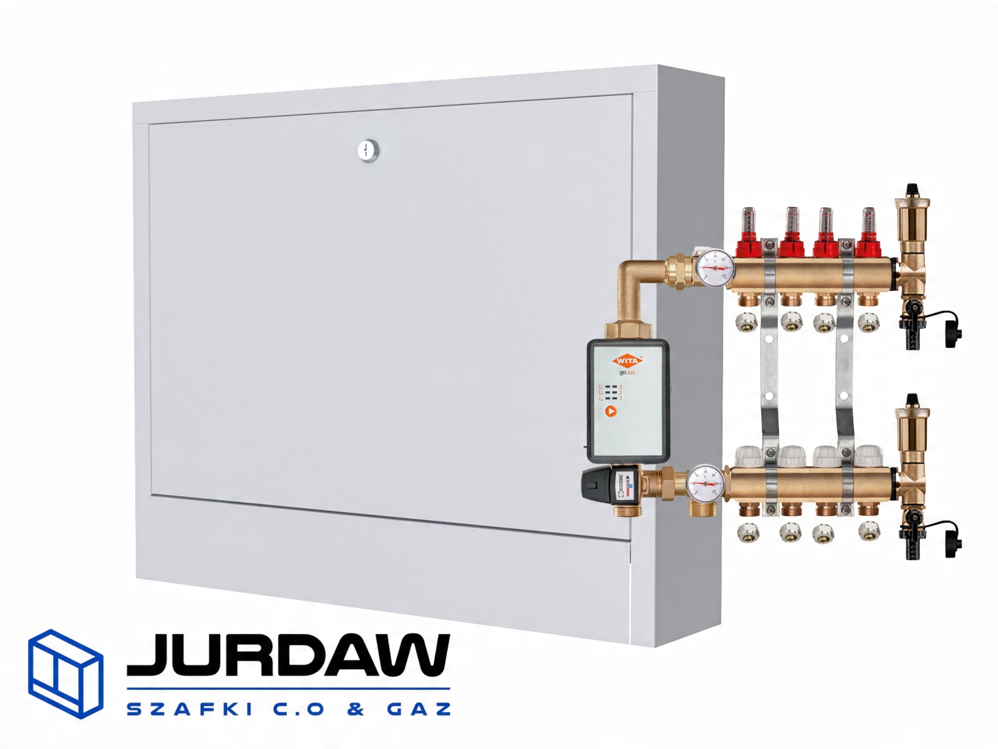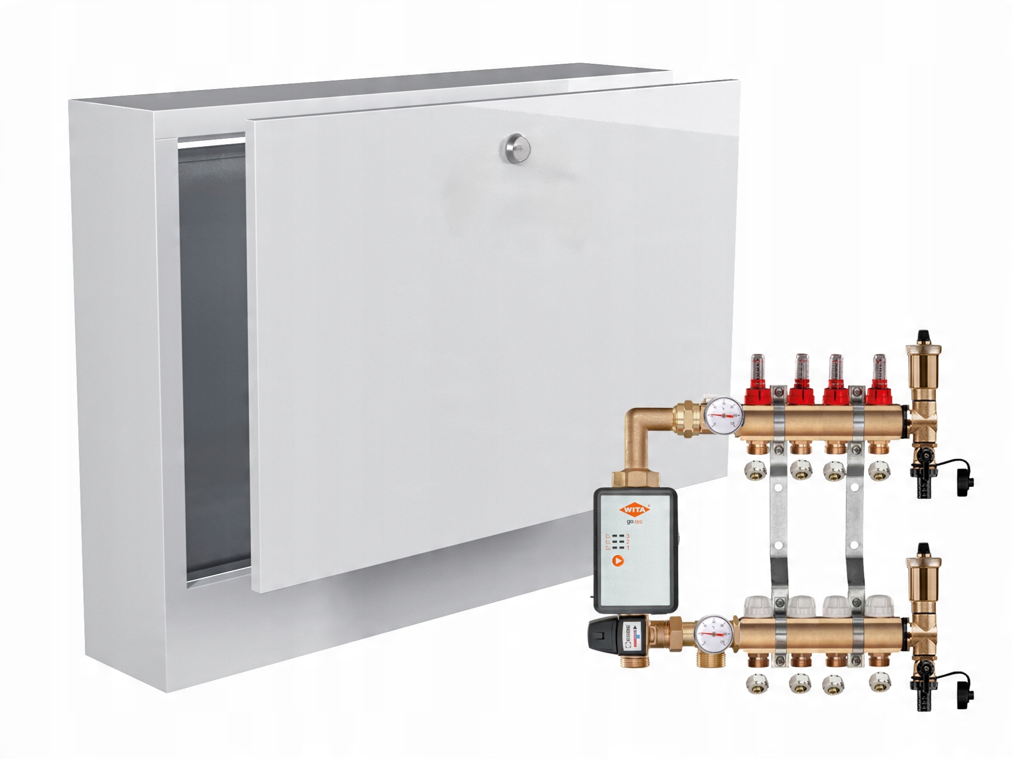 KOMPLETNY ROZDZIELACZ MOSIĘŻNY 4 SEKCJE Z GRUPĄ POMPOWĄ WITA GO.TEC 60 + ZŁĄCZKI PEX + SKRZYNKA PODTYNKOWA - POLSKI PRODUCENT