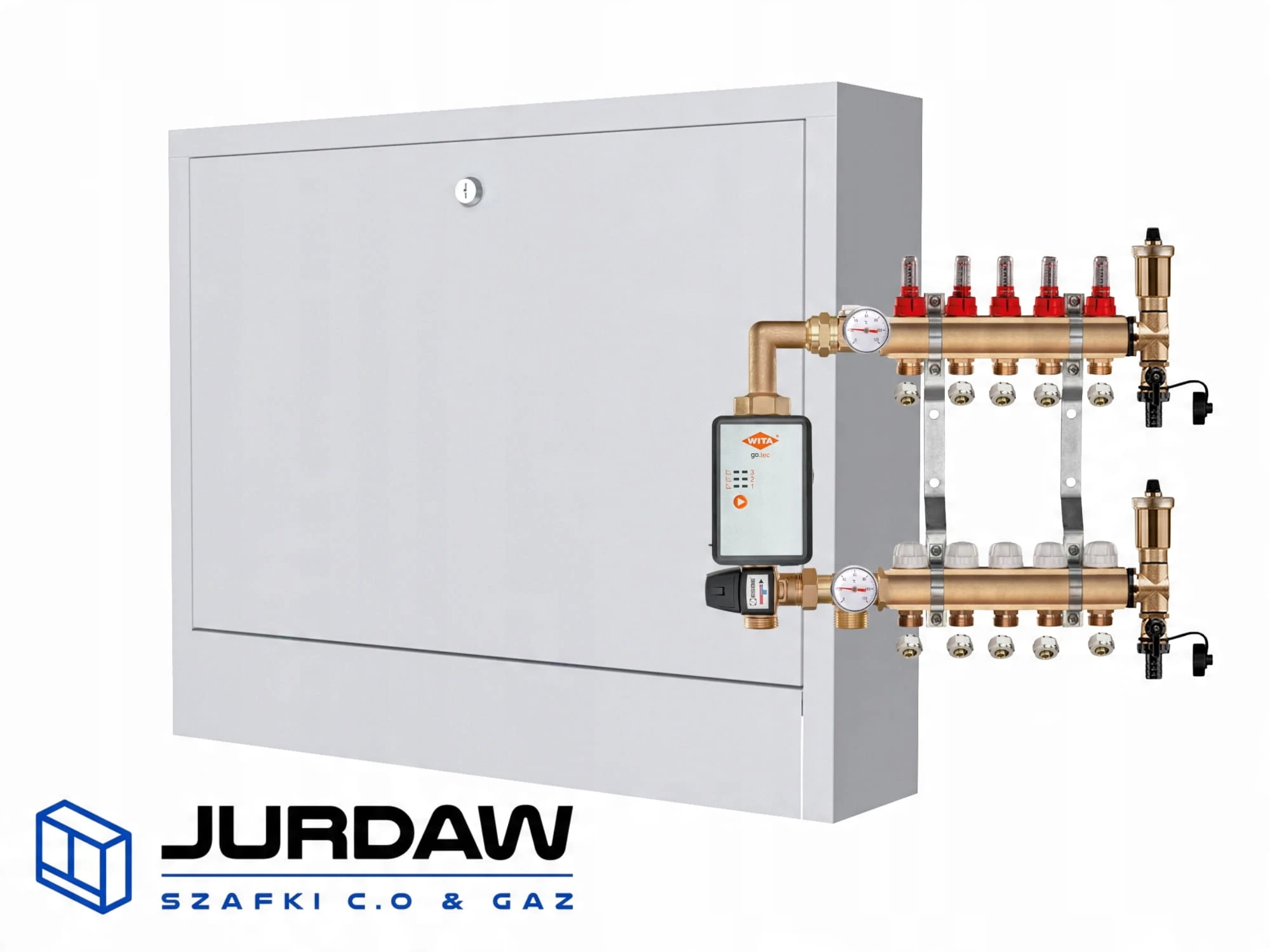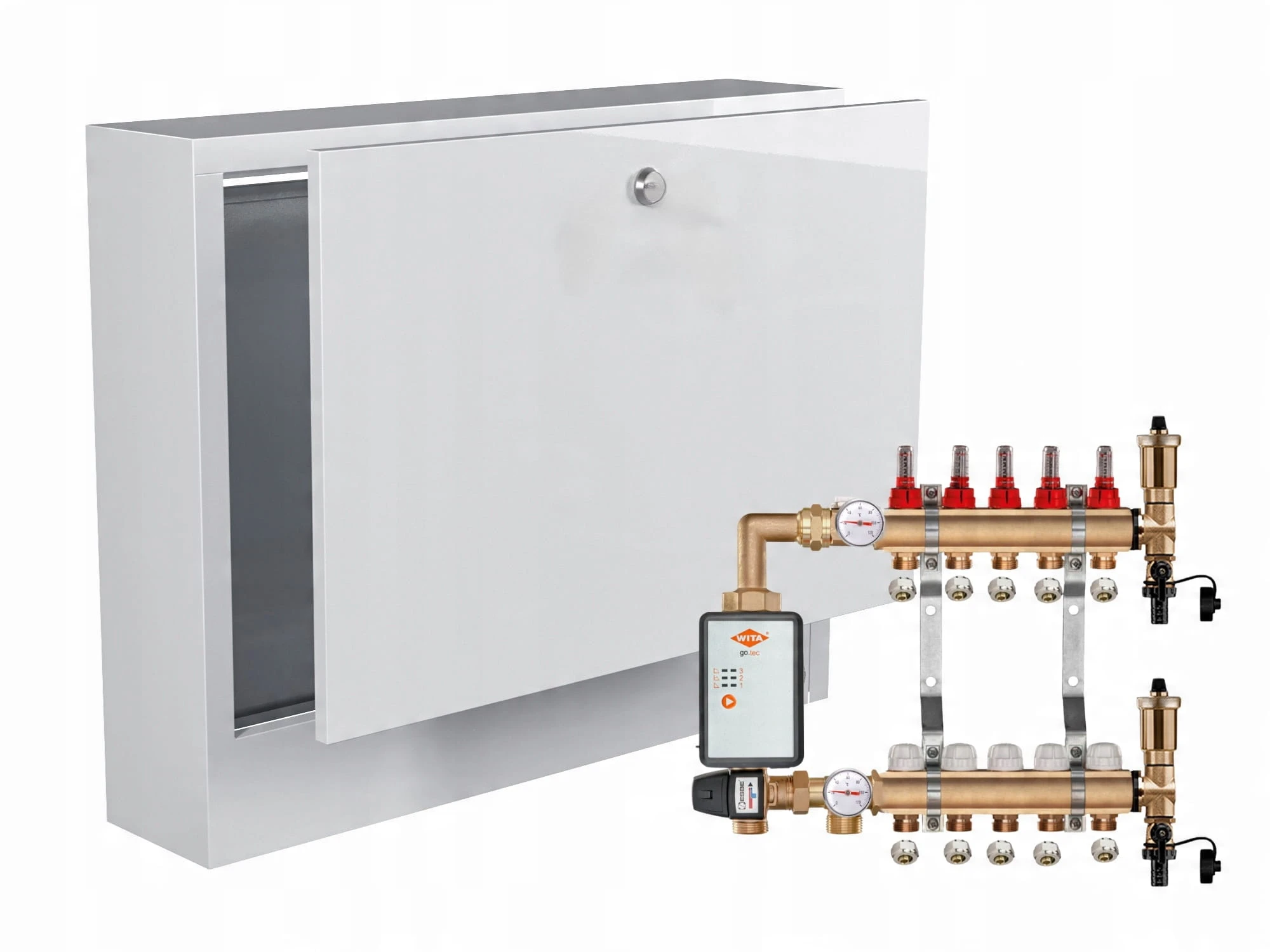 KOMPLETNY ROZDZIELACZ MOSIĘŻNY 5 SEKCJE Z GRUPĄ POMPOWĄ WITA GO.TEC 60 + ZŁĄCZKI PEX + SKRZYNKA PODTYNKOWA - POLSKI PRODUCENT