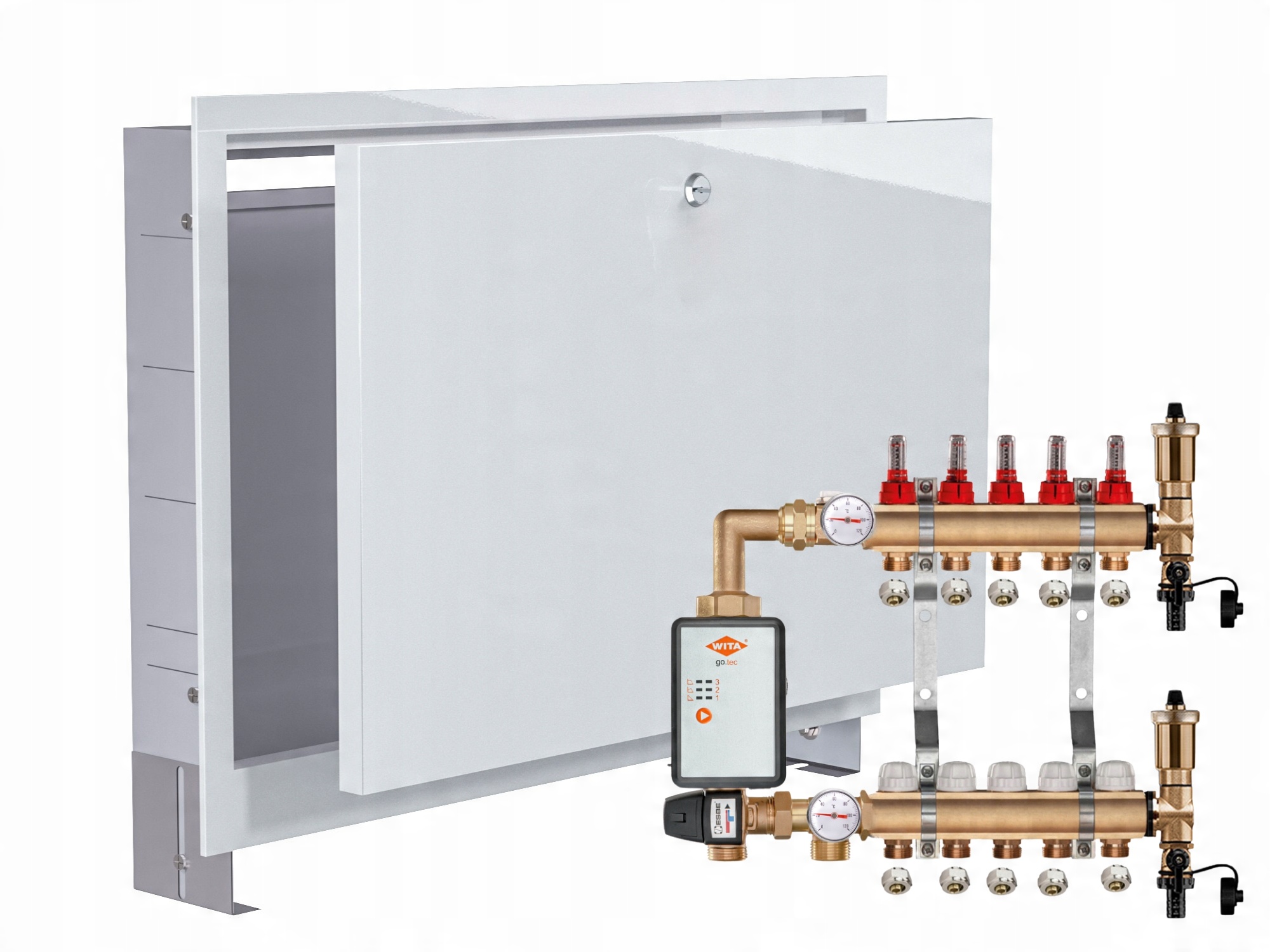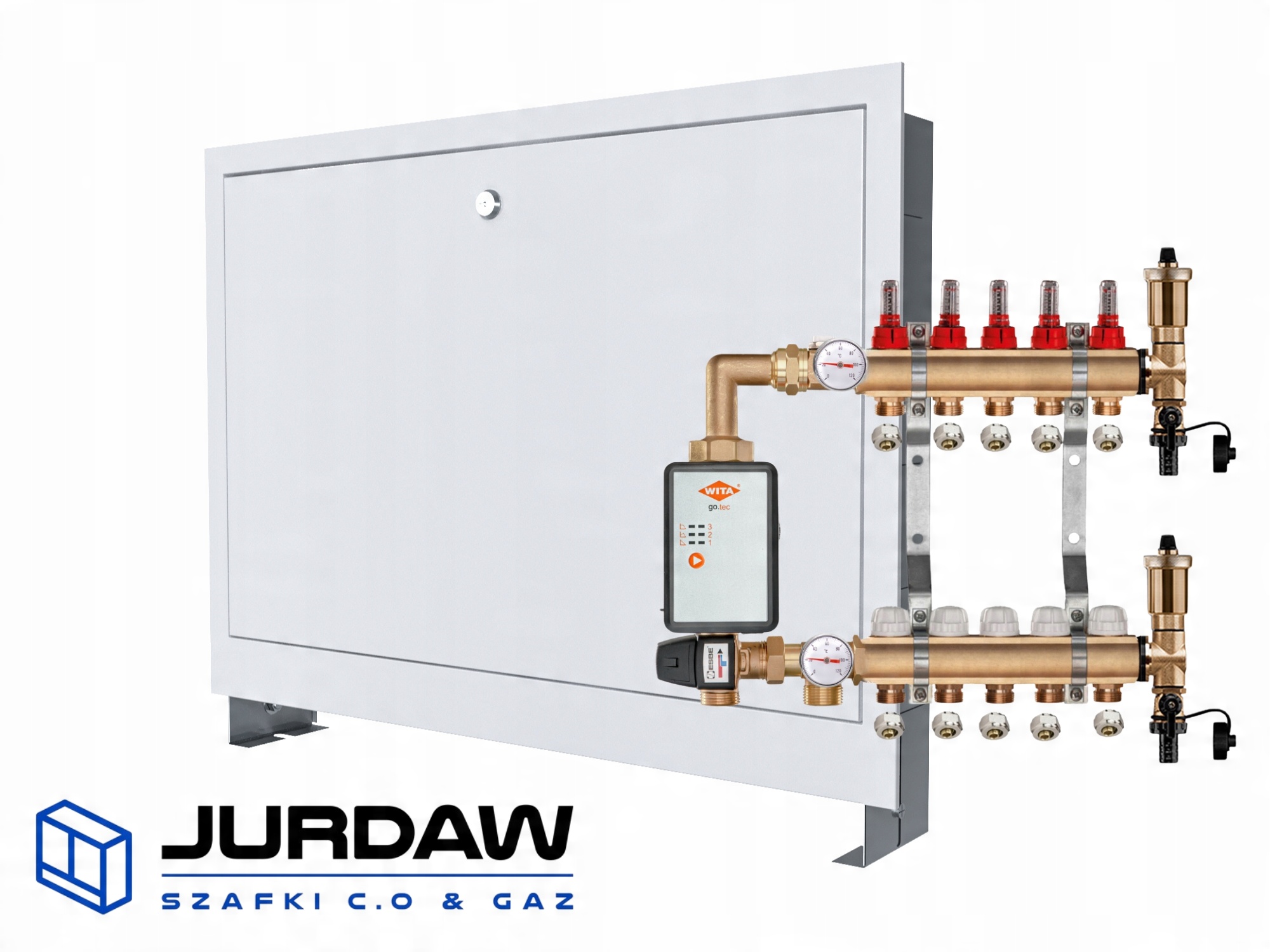 KOMPLETNY ROZDZIELACZ MOSIĘŻNY 5 SEKCJE Z GRUPĄ POMPOWĄ WITA GO.TEC 60 + ZŁĄCZKI PEX + SKRZYNKA PODTYNKOWA - POLSKI PRODUCENT