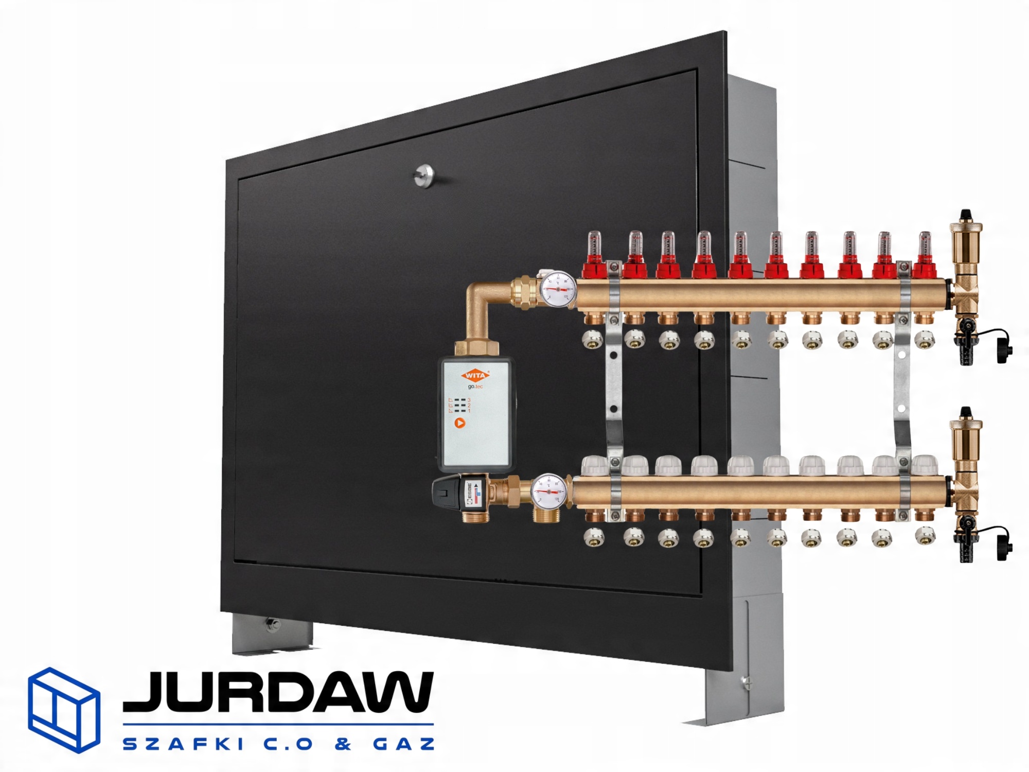 KOMPLETNY ROZDZIELACZ MOSIĘŻNY 10 SEKCJE Z GRUPĄ POMPOWĄ WITA GO.TEC 60 + ZŁĄCZKI PEX + SKRZYNKA PODTYNKOWA CZARNA - POLSKI PRODUCENT