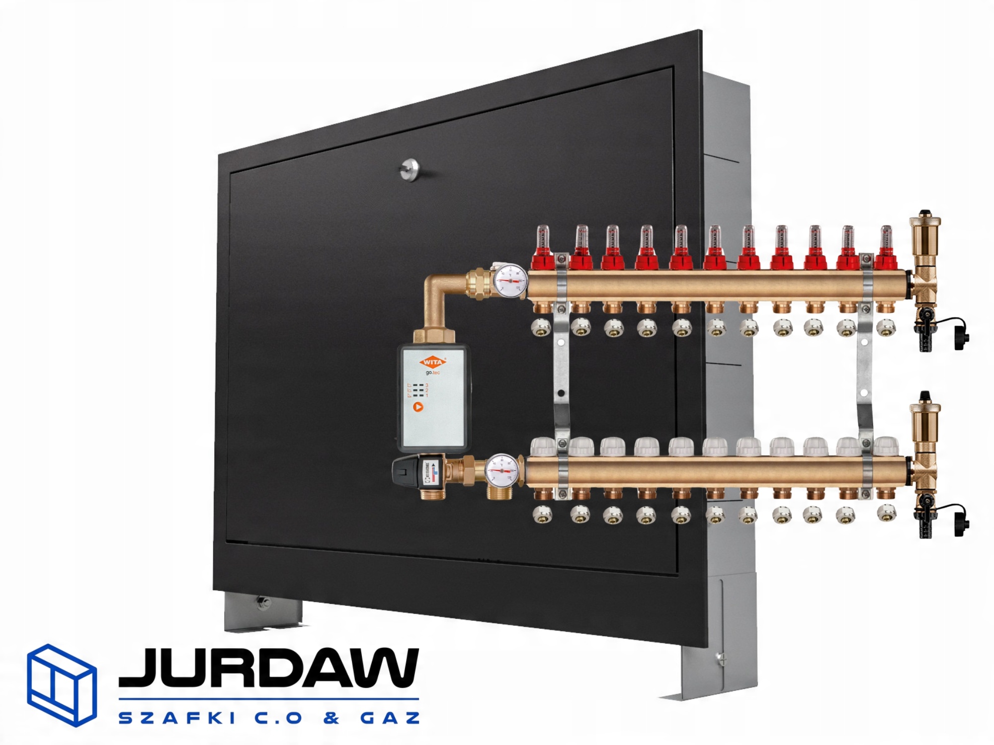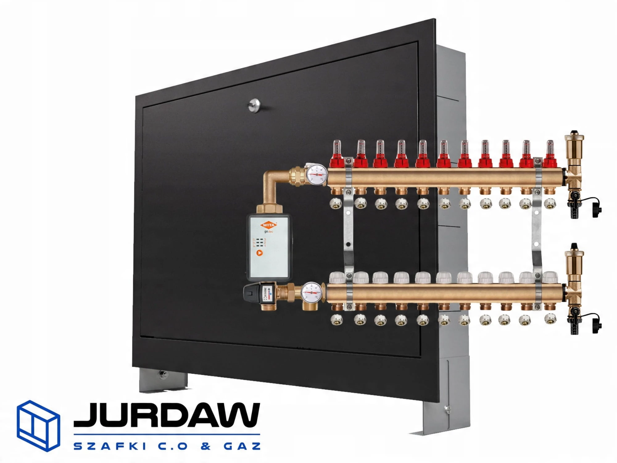 KOMPLETNY ROZDZIELACZ MOSIĘŻNY 11 SEKCJE Z GRUPĄ POMPOWĄ WITA GO.TEC 60 + ZŁĄCZKI PEX + SKRZYNKA PODTYNKOWA CZARNA - POLSKI PRODUCENT