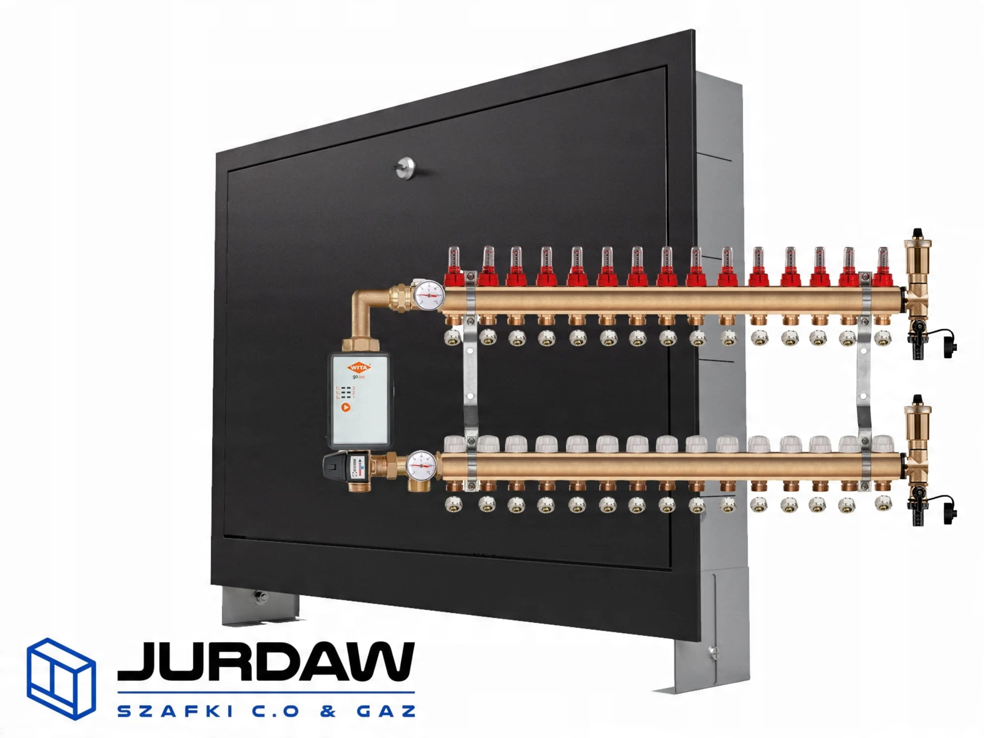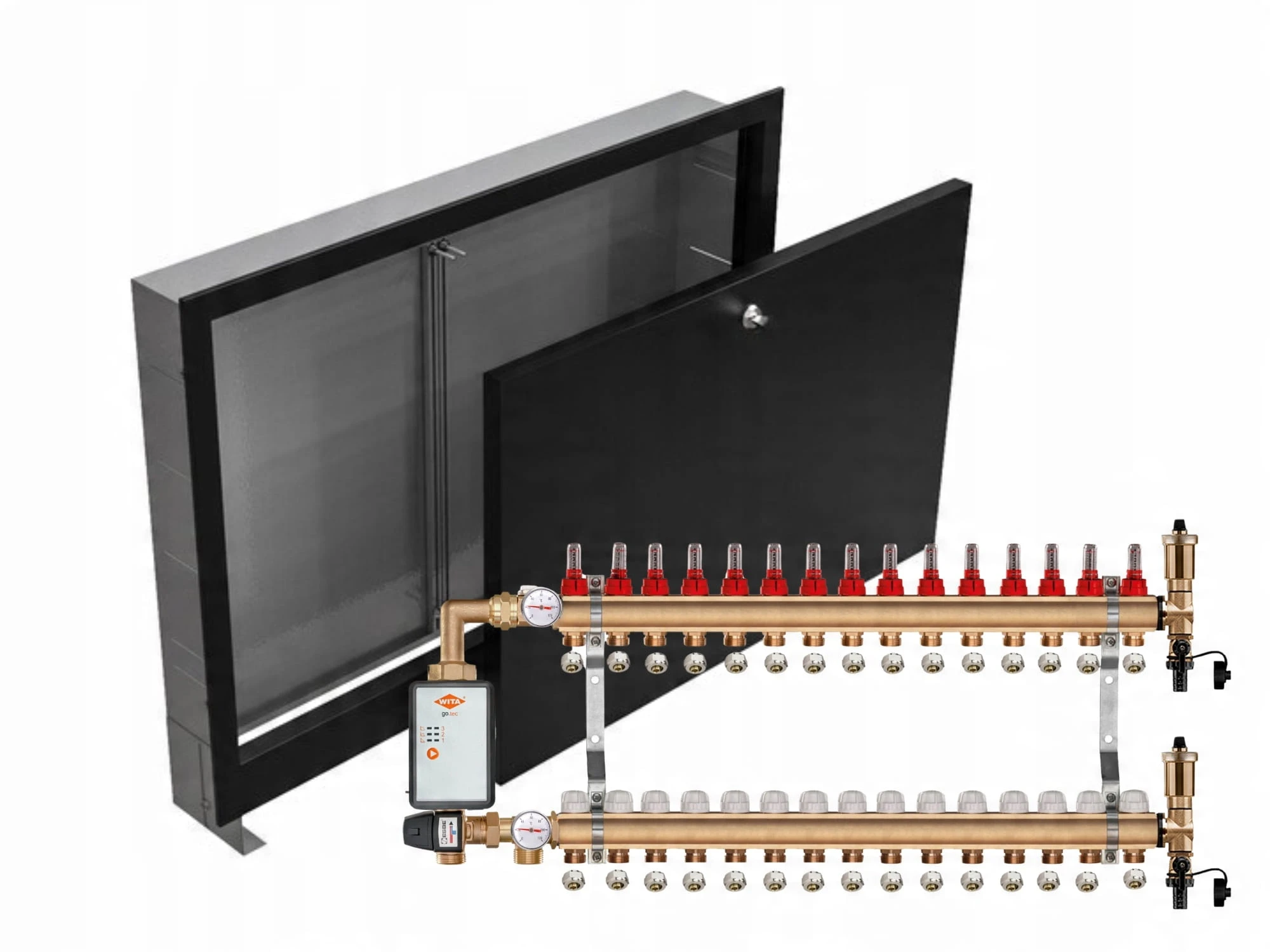 KOMPLETNY ROZDZIELACZ MOSIĘŻNY 15 SEKCJE Z GRUPĄ POMPOWĄ WITA GO.TEC 60 + ZŁĄCZKI PEX + SKRZYNKA PODTYNKOWA CZARNA - POLSKI PRODUCENT