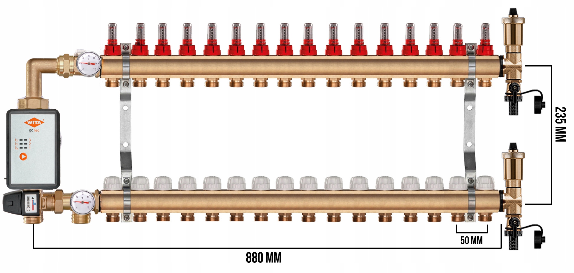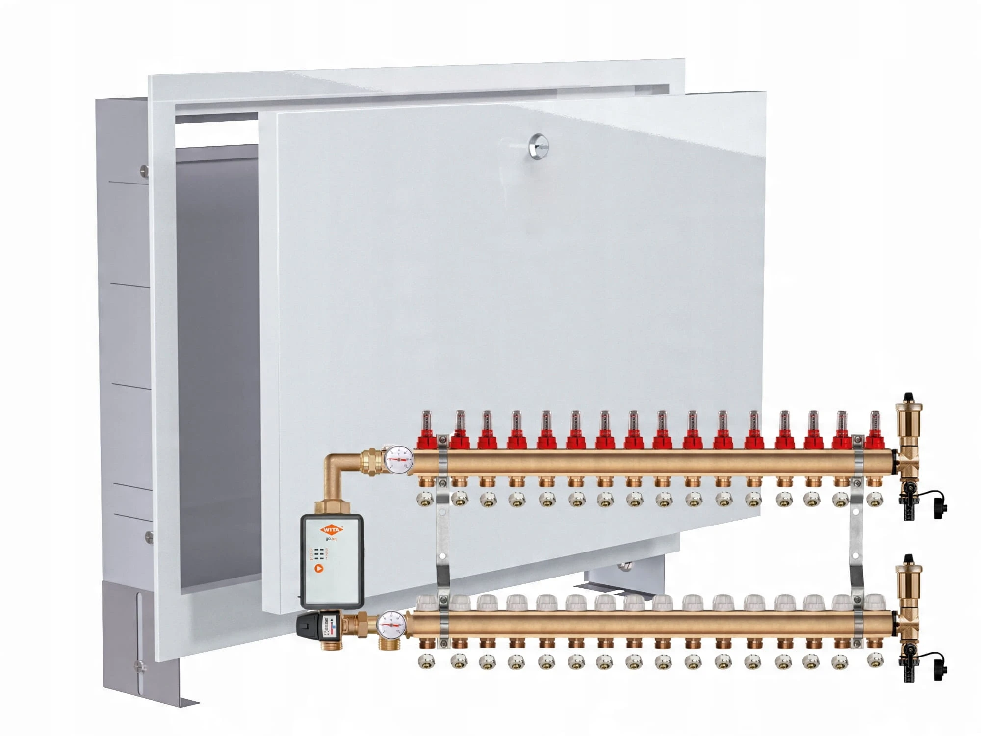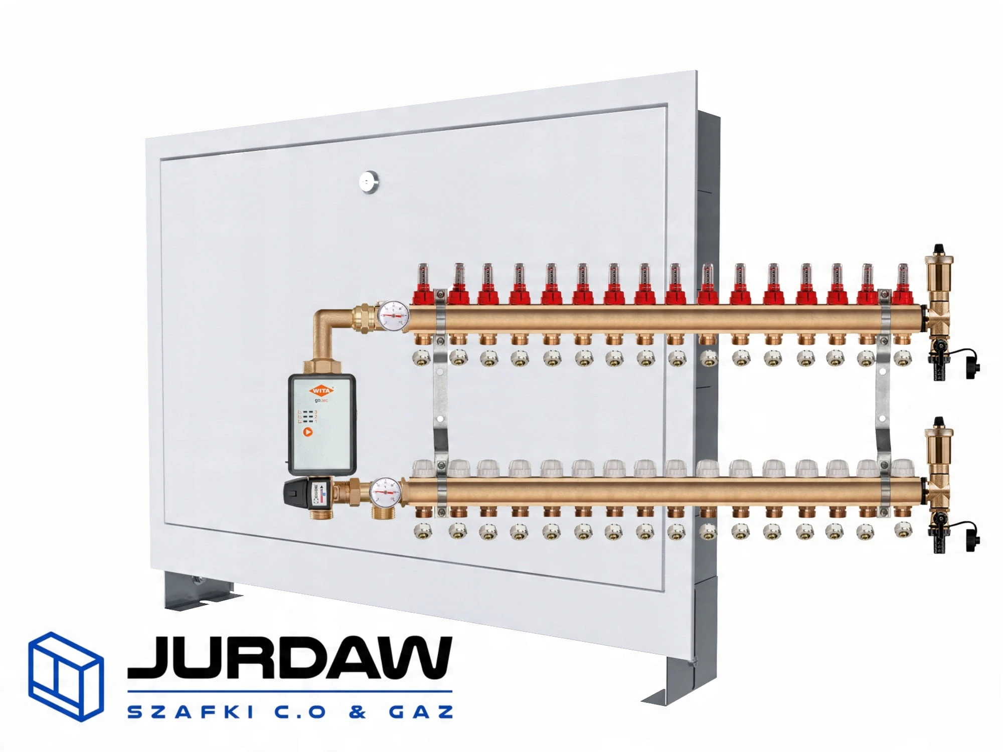 KOMPLETNY ROZDZIELACZ MOSIĘŻNY 16 SEKCJE Z GRUPĄ POMPOWĄ WITA GO.TEC 60 + ZŁĄCZKI PEX + SKRZYNKA PODTYNKOWA - POLSKI PRODUCENT