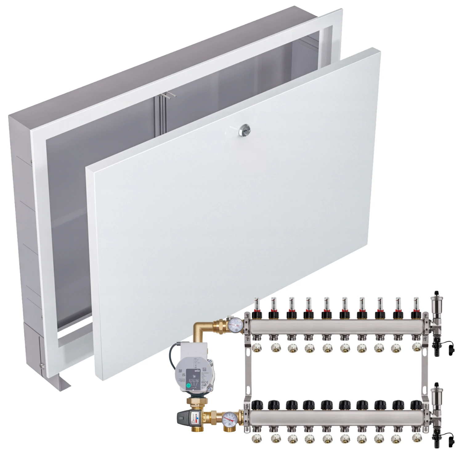 KOMPLETNY ZESTAW ROZDZIELACZ NIERDZEWNY DO PODŁOGÓWKI 10 z GRUPĄ POMPOWĄ WILO + SKRZYNKA PODTYNKOWA + ZŁĄCZKI PEX