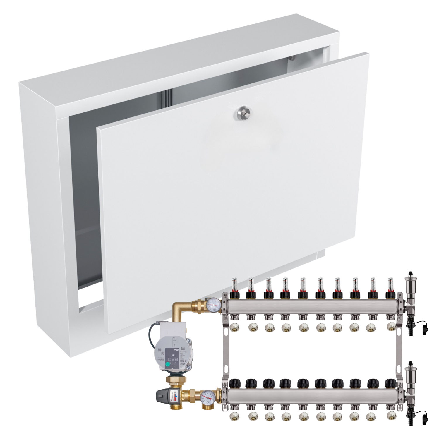 KOMPLETNY ZESTAW ROZDZIELACZ NIERDZEWNY DO PODŁOGÓWKI 10 z GRUPĄ POMPOWĄ WILO + SKRZYNKA NATYNKOWA + ZŁĄCZKI PEX