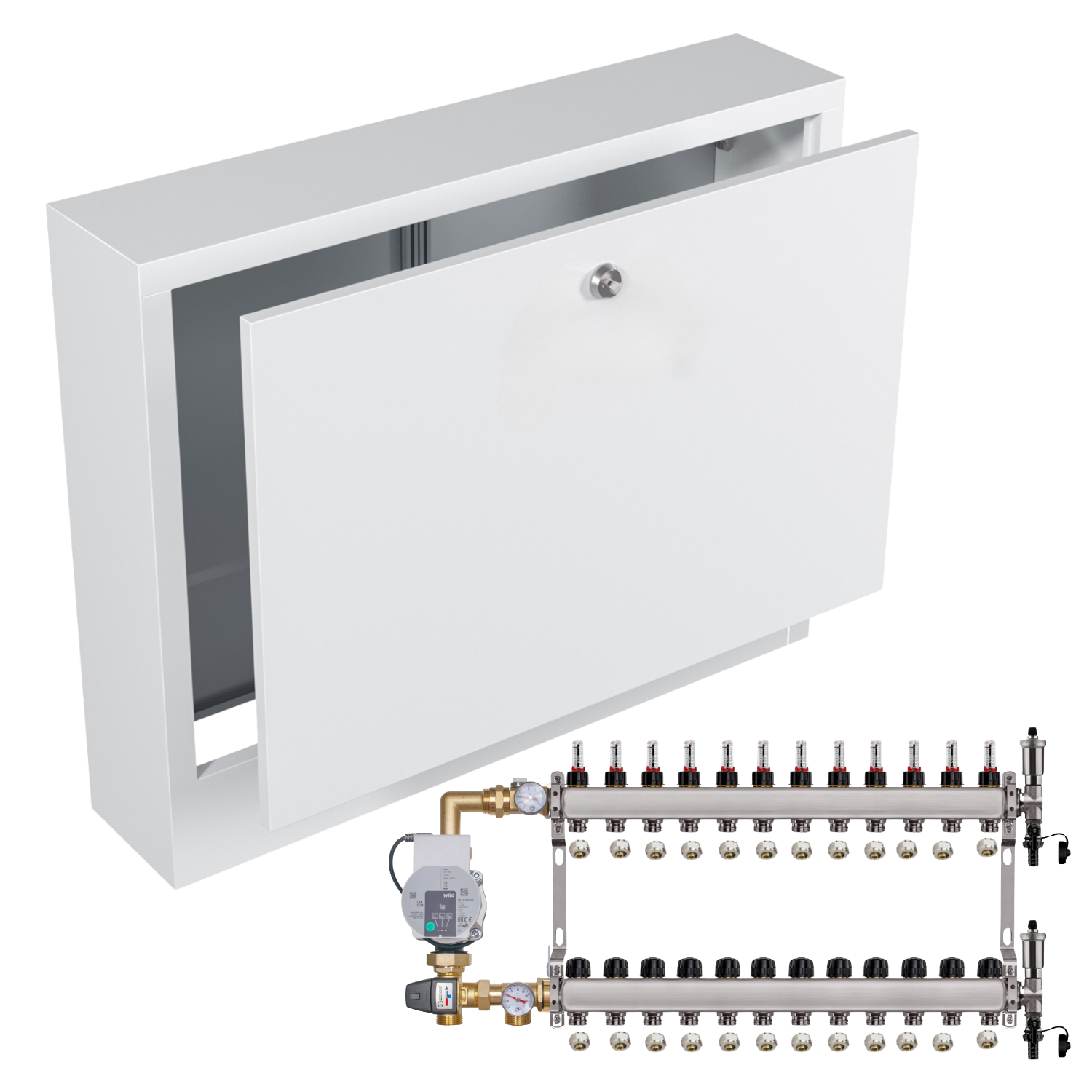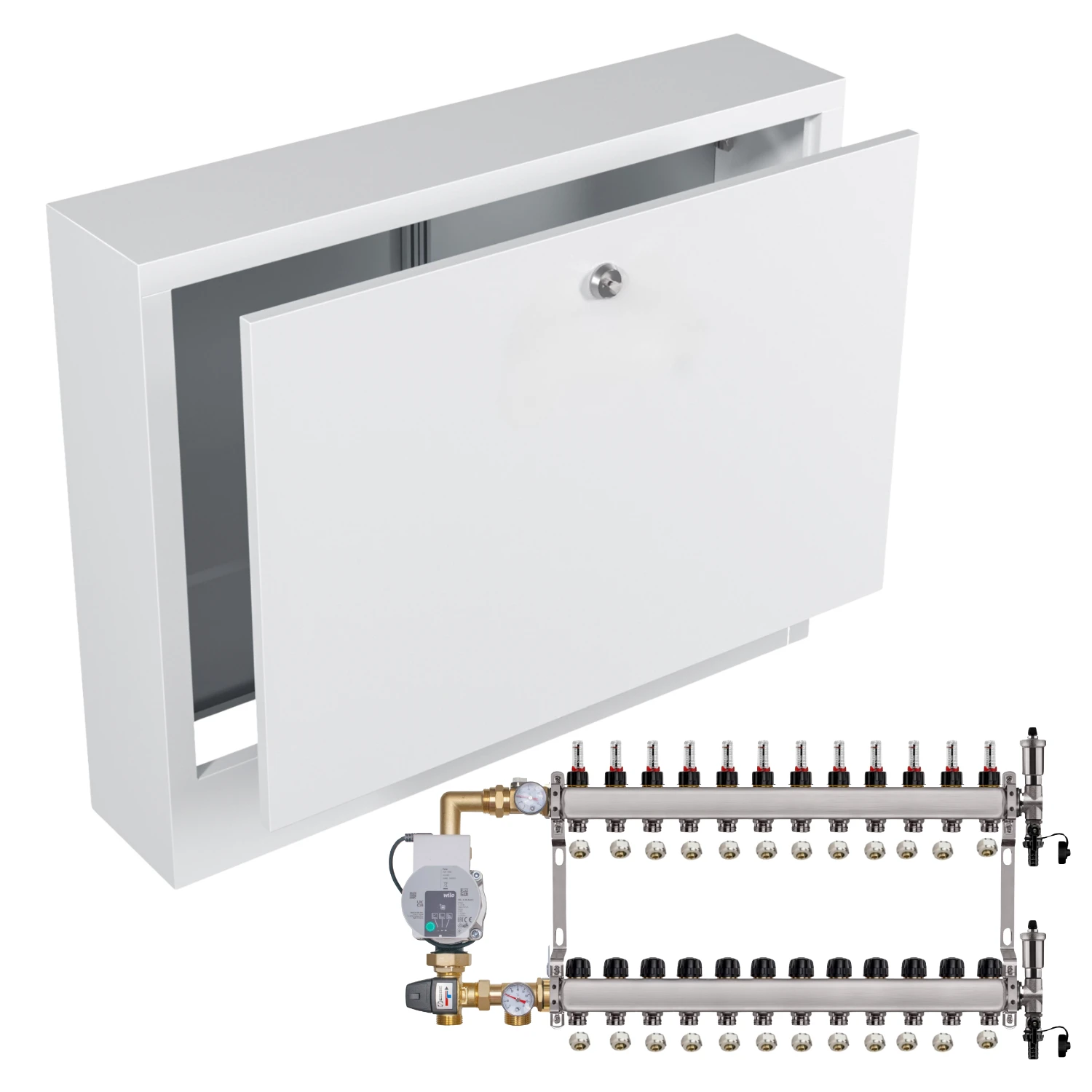 KOMPLETNY ZESTAW ROZDZIELACZ NIERDZEWNY DO PODŁOGÓWKI 12 z GRUPĄ POMPOWĄ WILO + SKRZYNKA NATYNKOWA + ZŁĄCZKI PEX