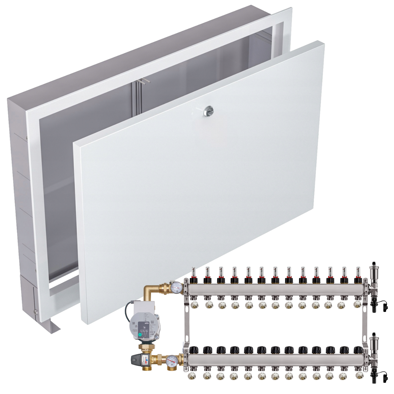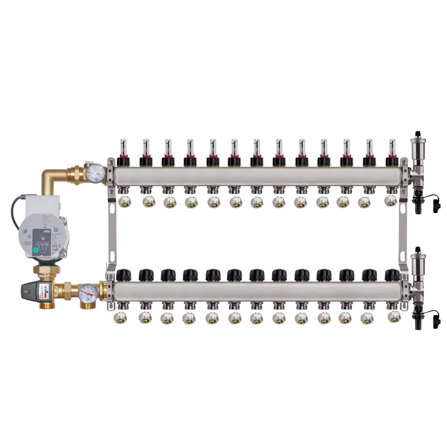 KOMPLETNY ZESTAW ROZDZIELACZ NIERDZEWNY DO PODŁOGÓWKI 13 z GRUPĄ POMPOWĄ WILO + SKRZYNKA PODTYNKOWA + ZŁĄCZKI PEX