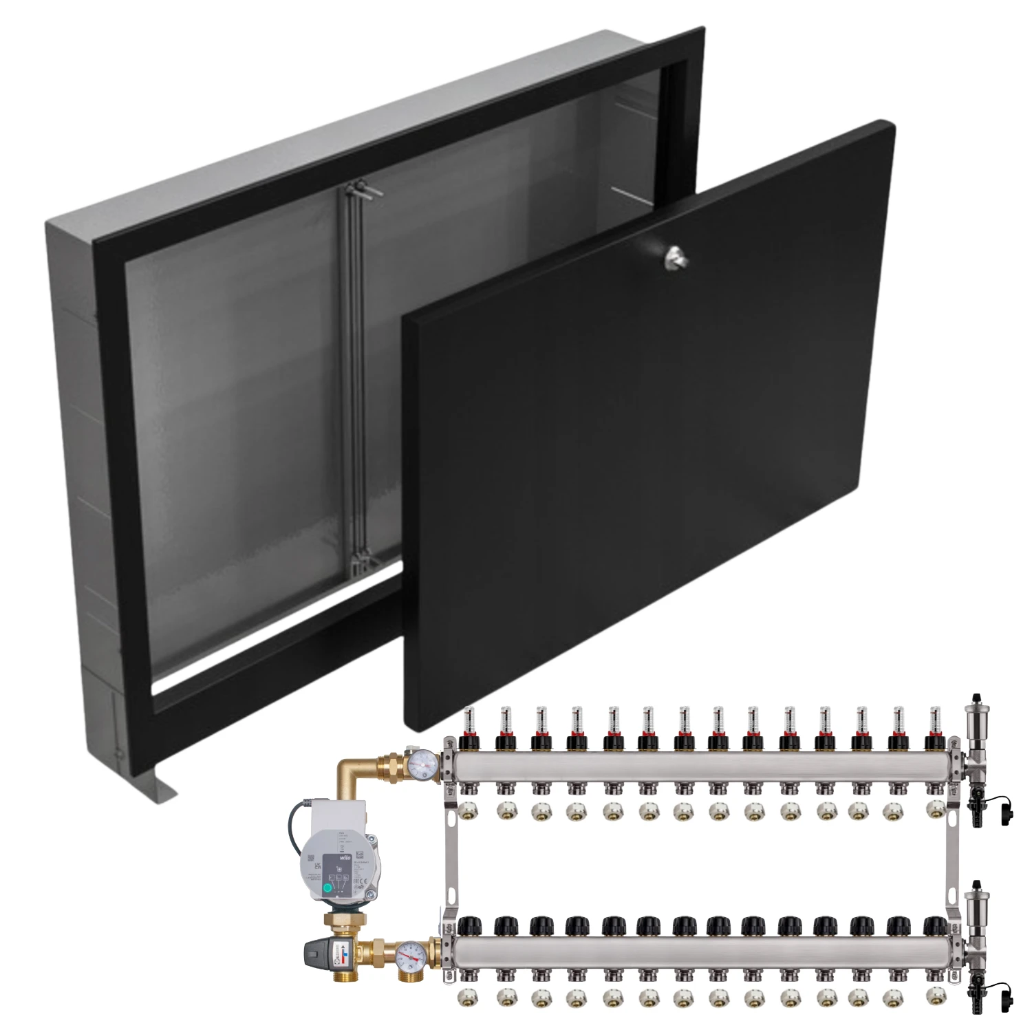 KOMPLETNY ZESTAW ROZDZIELACZ NIERDZEWNY DO PODŁOGÓWKI 14 z GRUPĄ POMPOWĄ WILO + PODTYNKOWA + ZŁĄCZKI PEX