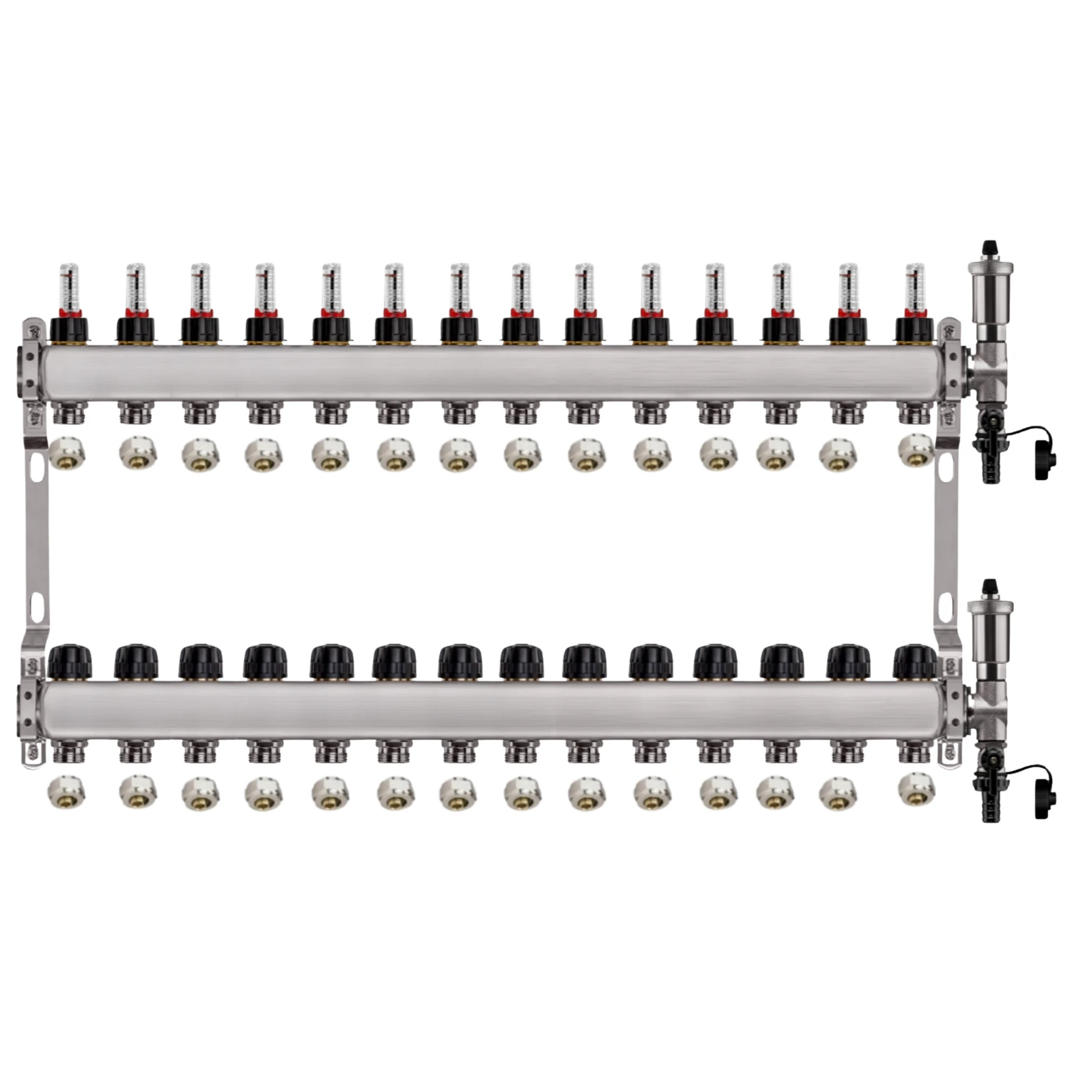 Zestaw wyposażony jest w przepływomierze (rotametry) z zaworami regulacyjnymi, które umożliwiają precyzyjną i szybką regulację przepływu dzięki skali umieszczonej na zaworze (do 5 l/min). Dodatkowo, w skład zestawu wchodzi zespół odpowietrzająco-spustowy z automatycznym odpowietrznikiem i systemem Aquastop, chroniący przed zalaniem. Zawór stopowy pozwala na łatwą wymianę i konserwację odpowietrznika bez konieczności opróżniania instalacji. Zawory termostatyczne z pokrętłami umożliwiają wyrównanie przepływu w pętlach o różnej długości oraz zrównoważenie instalacji pod względem oporów hydraulicznych. Wkładki termostatyczne są przystosowane do montażu siłowników elektrycznych M30x1,5, co pozwala na ręczną regulację przepływu lub całkowite zamknięcie wybranej pętli.