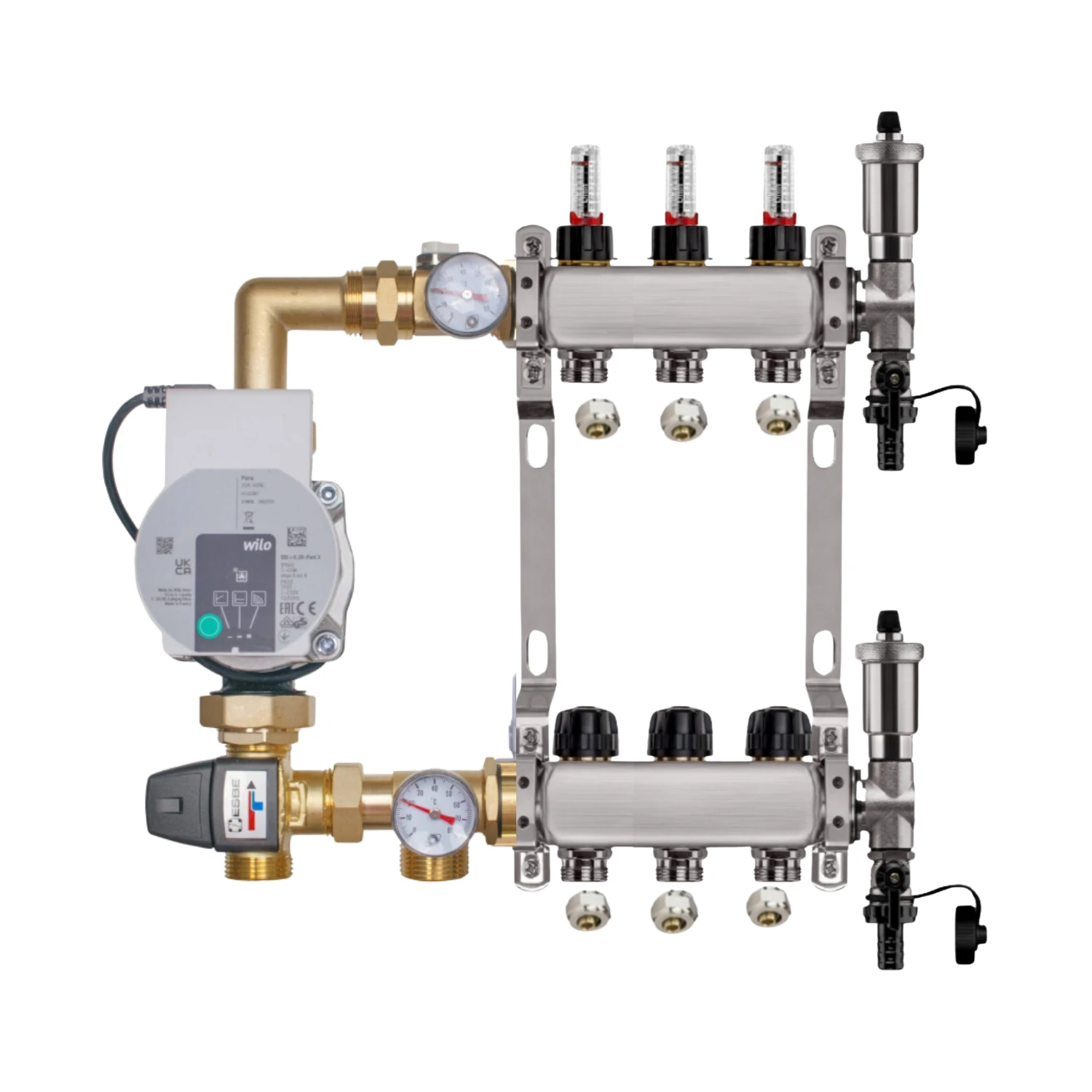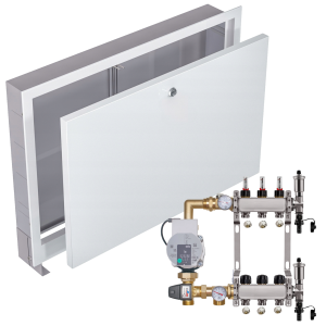 KOMPLETNY ZESTAW ROZDZIELACZ NIERDZEWNY DO PODŁOGÓWKI 3 z GRUPĄ POMPOWĄ WILO + SKRZYNKA PODTYNKOWA + ZŁĄCZKI PEX