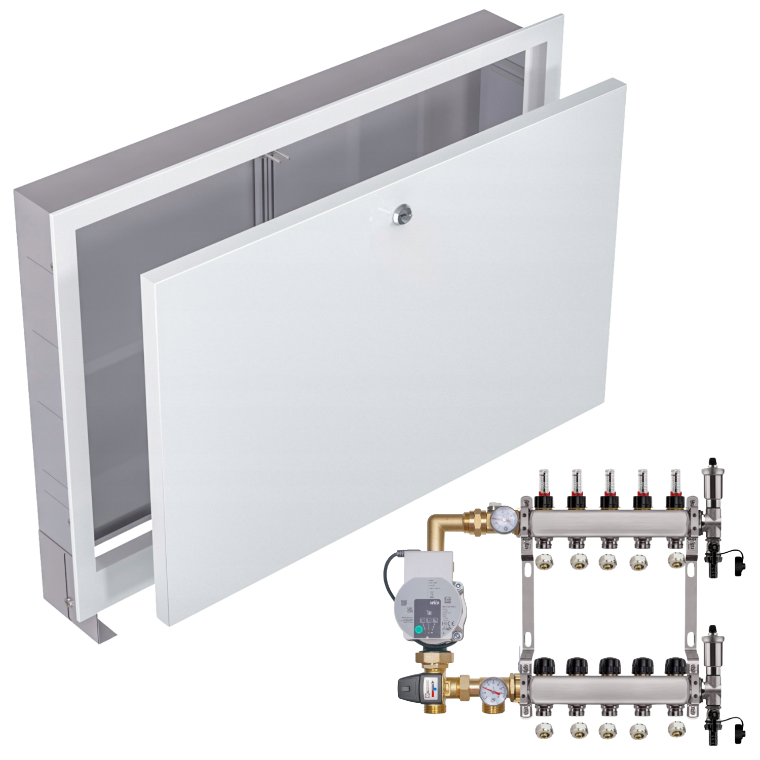 KOMPLETNY ZESTAW ROZDZIELACZ NIERDZEWNY DO PODŁOGÓWKI 5 z GRUPĄ POMPOWĄ WILO + SKRZYNKA PODTYNKOWA + ZŁĄCZKI PEX