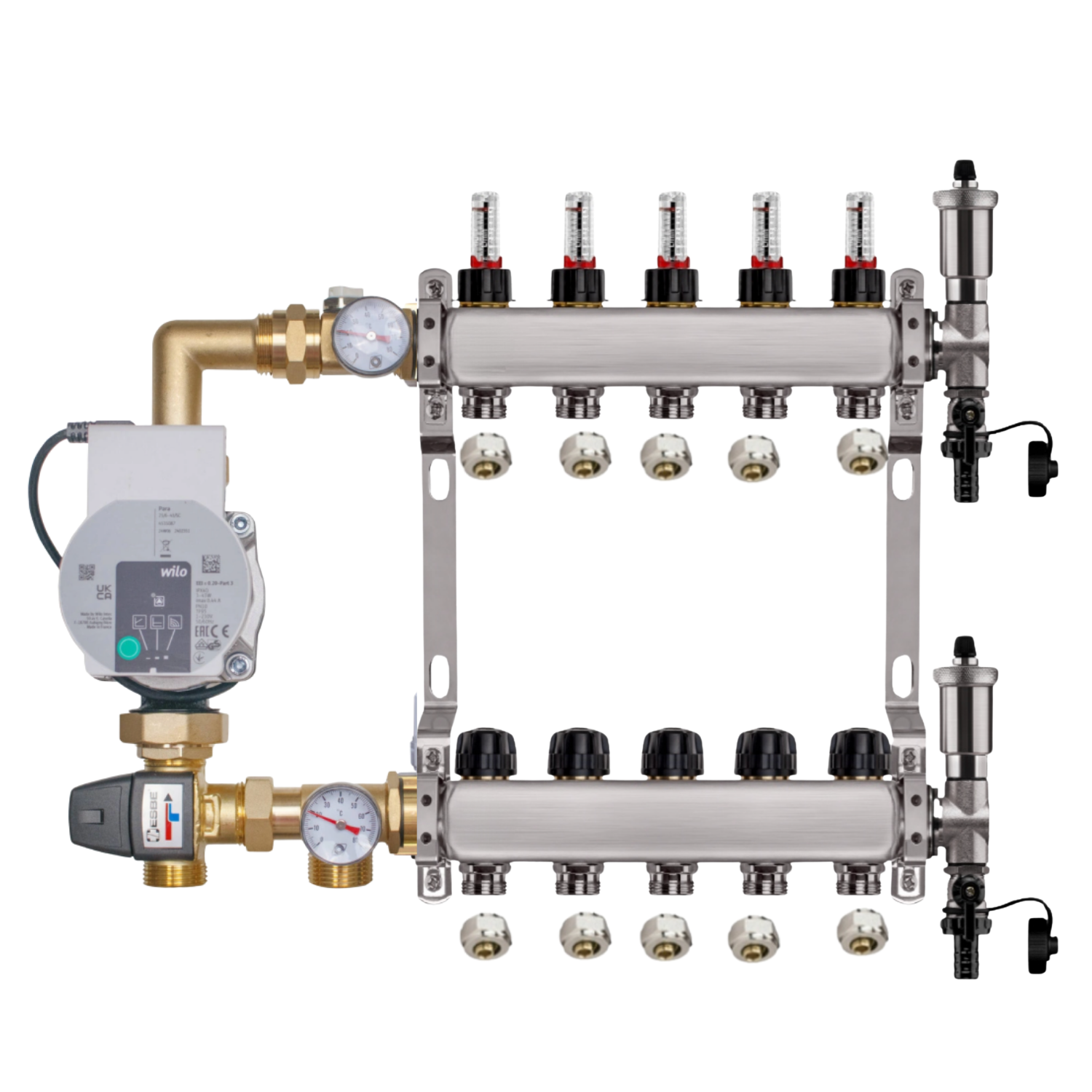 KOMPLETNY ZESTAW ROZDZIELACZ NIERDZEWNY DO PODŁOGÓWKI 5 z GRUPĄ POMPOWĄ WILO + SKRZYNKA NATYNKOWA + ZŁĄCZKI PEX