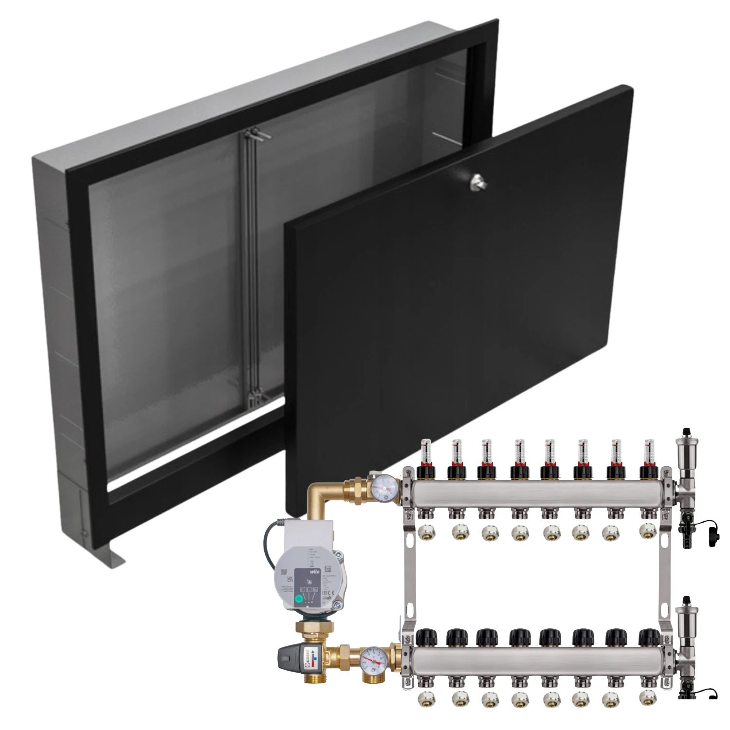 KOMPLETNY ZESTAW ROZDZIELACZ NIERDZEWNY DO PODŁOGÓWKI 8 z GRUPĄ POMPOWĄ WILO + SKRZYNKA PODTYNKOWA + ZŁĄCZKI PEX