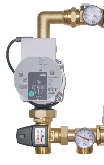 Wilo Yonos Para RS25/6-RKA oraz najwyższej jakości termostatyczny zawór mieszający ESBE VTA 372 1' cal o zwiększonym przepływie 3,4 KVS posiadający regulację temperatury w zakresie 20-50 stopni Celcjusza