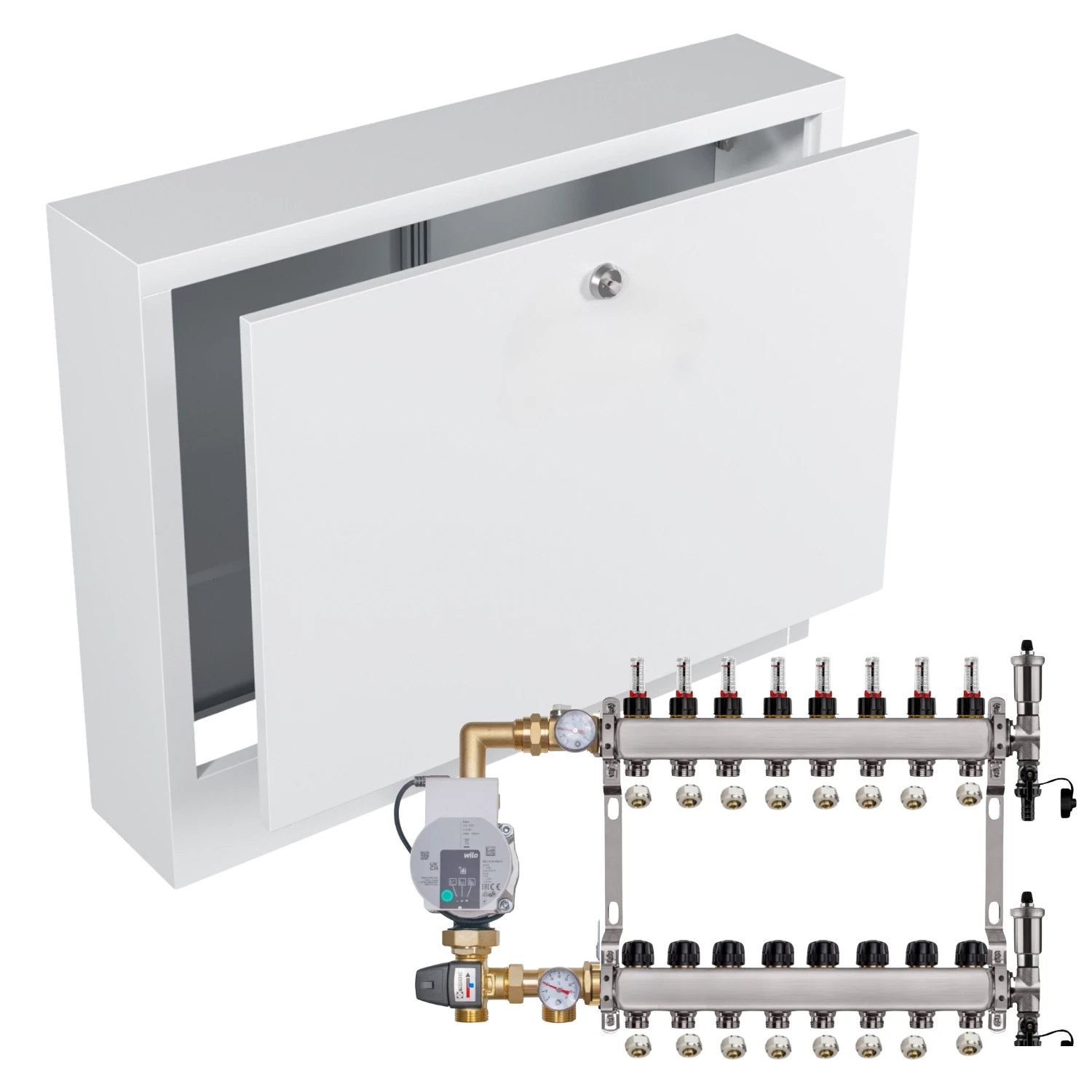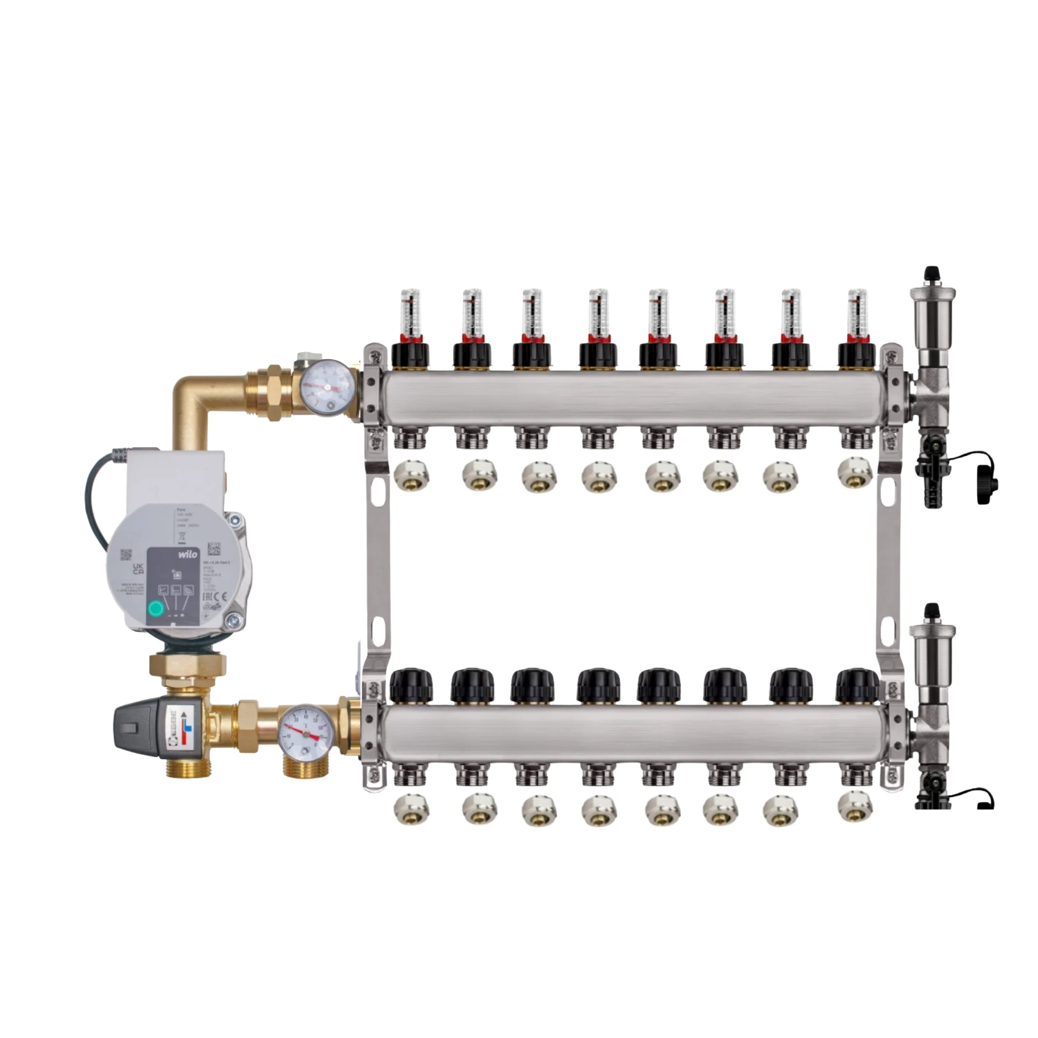 KOMPLETNY ZESTAW ROZDZIELACZ NIERDZEWNY DO PODŁOGÓWKI 8 z GRUPĄ POMPOWĄ WILO + SKRZYNKA NATYNKOWA + ZŁĄCZKI PEX