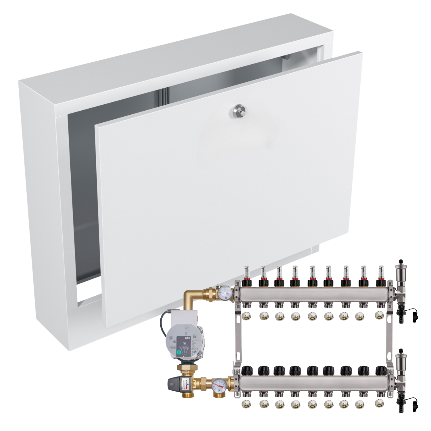 KOMPLETNY ZESTAW ROZDZIELACZ NIERDZEWNY DO PODŁOGÓWKI 10 z GRUPĄ POMPOWĄ WILO + SKRZYNKA NATYNKOWA + ZŁĄCZKI PEX