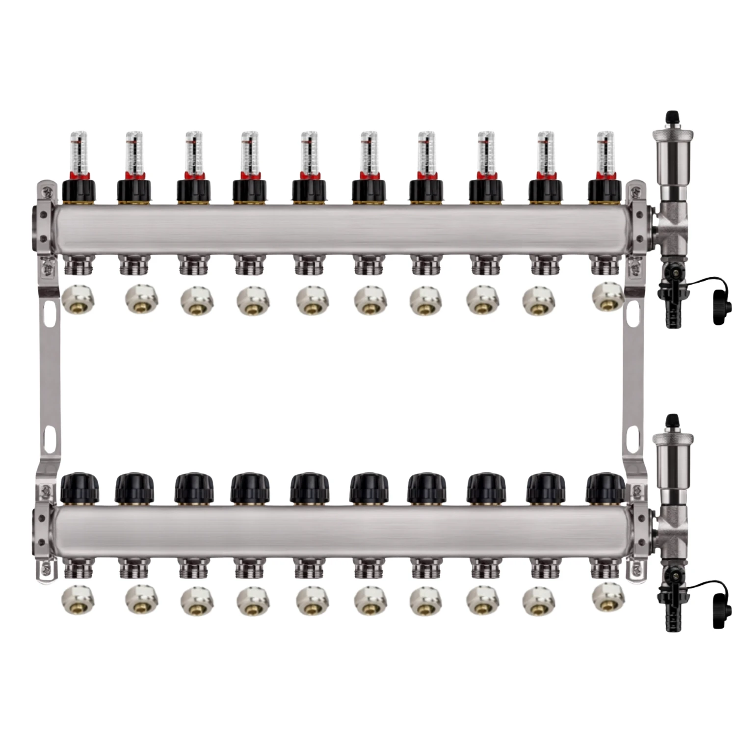 Zestaw wyposażony jest w przepływomierze (rotametry) z zaworami regulacyjnymi, które umożliwiają precyzyjną i szybką regulację przepływu dzięki skali umieszczonej na zaworze (do 5 l/min). Dodatkowo, w skład zestawu wchodzi zespół odpowietrzająco-spustowy z automatycznym odpowietrznikiem i systemem Aquastop, chroniący przed zalaniem. Zawór stopowy pozwala na łatwą wymianę i konserwację odpowietrznika bez konieczności opróżniania instalacji. Zawory termostatyczne z pokrętłami umożliwiają wyrównanie przepływu w pętlach o różnej długości oraz zrównoważenie instalacji pod względem oporów hydraulicznych. Wkładki termostatyczne są przystosowane do montażu siłowników elektrycznych M30x1,5, co pozwala na ręczną regulację przepływu lub całkowite zamknięcie wybranej pętli.