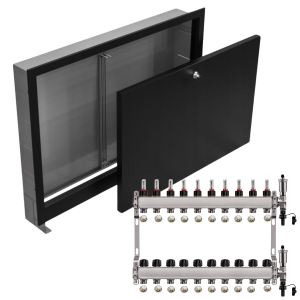 - Kompaktowe wymiary – rozdzielacz i szafka mają praktyczne wymiary, co ułatwia dopasowanie ich do różnych przestrzeni i instalacji.
