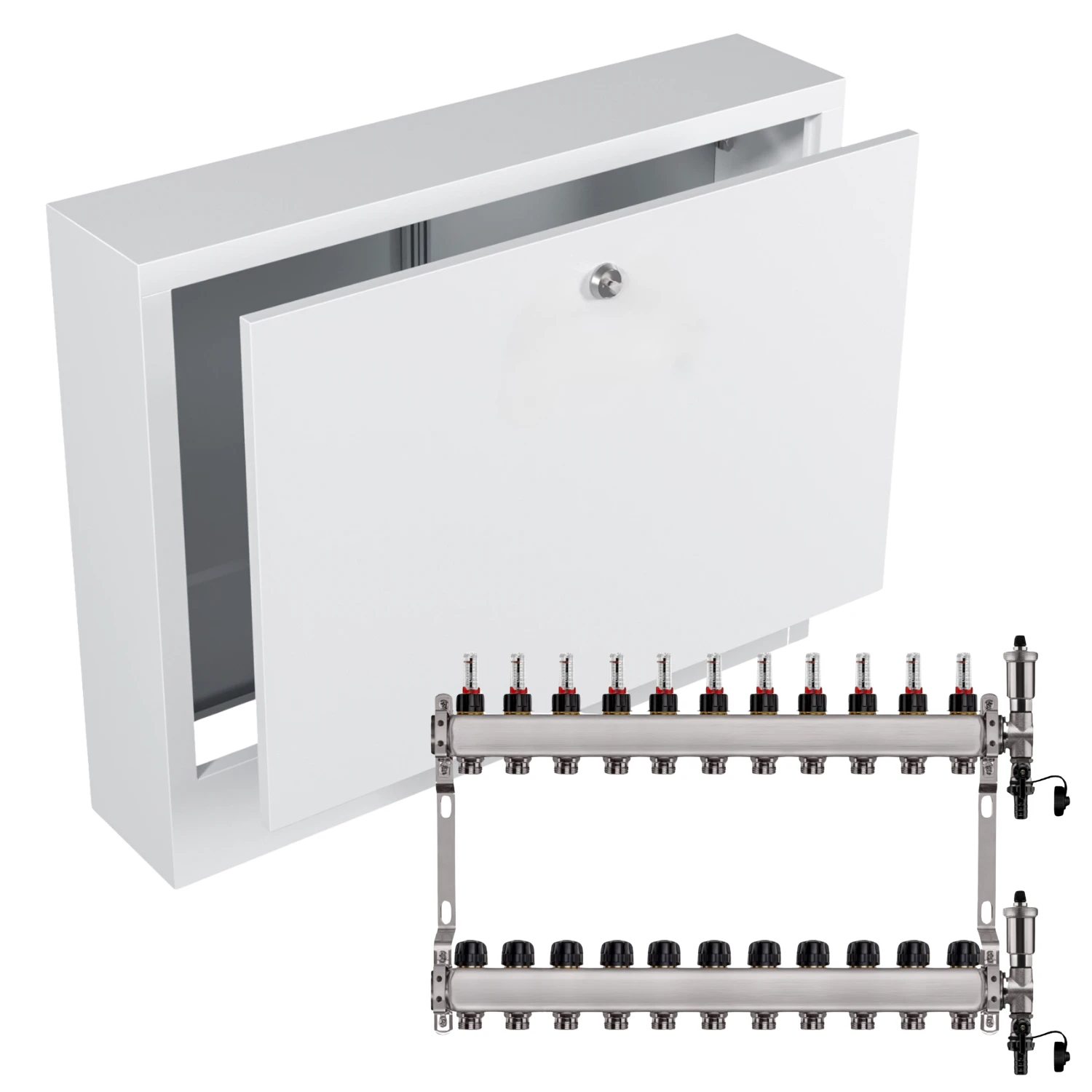 - Kompaktowe wymiary – rozdzielacz i szafka mają praktyczne wymiary, co ułatwia dopasowanie ich do różnych przestrzeni i instalacji.
