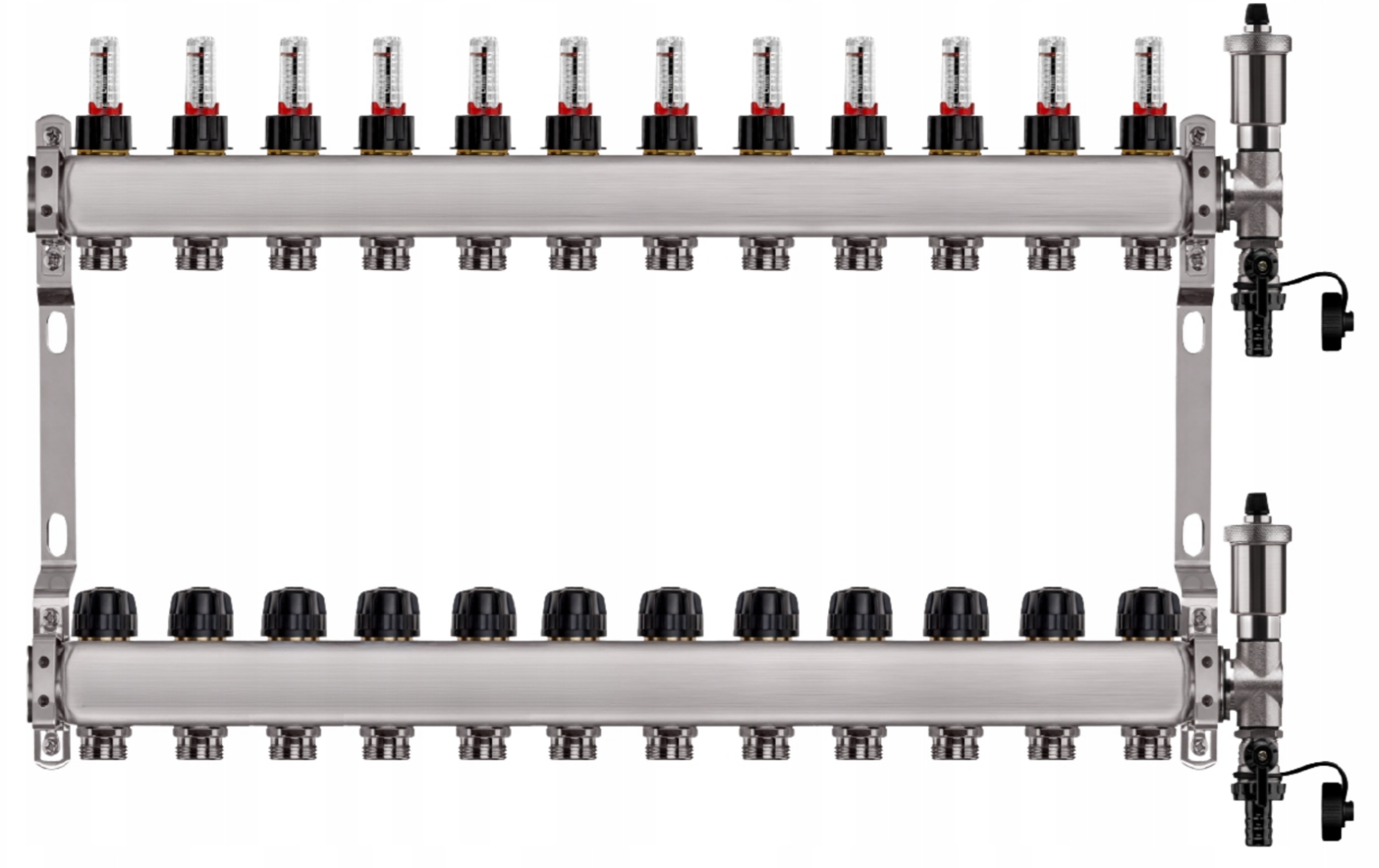 Zestaw wyposażony jest w przepływomierze (rotametry) z zaworami regulacyjnymi, które umożliwiają precyzyjną i szybką regulację przepływu dzięki skali umieszczonej na zaworze (do 5 l/min). Dodatkowo, w skład zestawu wchodzi zespół odpowietrzająco-spustowy z automatycznym odpowietrznikiem i systemem Aquastop, chroniący przed zalaniem. Zawór stopowy pozwala na łatwą wymianę i konserwację odpowietrznika bez konieczności opróżniania instalacji. Zawory termostatyczne z pokrętłami umożliwiają wyrównanie przepływu w pętlach o różnej długości oraz zrównoważenie instalacji pod względem oporów hydraulicznych. Wkładki termostatyczne są przystosowane do montażu siłowników elektrycznych M30x1,5, co pozwala na ręczną regulację przepływu lub całkowite zamknięcie wybranej pętli.