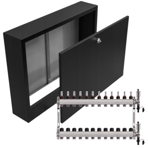 - Kompaktowe wymiary – rozdzielacz i szafka mają praktyczne wymiary, co ułatwia dopasowanie ich do różnych przestrzeni i instalacji.
