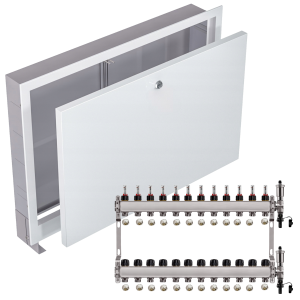 - Kompaktowe wymiary – rozdzielacz i szafka mają praktyczne wymiary, co ułatwia dopasowanie ich do różnych przestrzeni i instalacji.