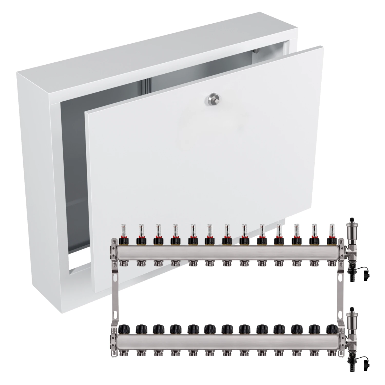 Zestaw wyposażony jest w przepływomierze (rotametry) z zaworami regulacyjnymi, które umożliwiają precyzyjną i szybką regulację przepływu dzięki skali umieszczonej na zaworze (do 5 l/min). Dodatkowo, w skład zestawu wchodzi zespół odpowietrzająco-spustowy z automatycznym odpowietrznikiem i systemem Aquastop, chroniący przed zalaniem. Zawór stopowy pozwala na łatwą wymianę i konserwację odpowietrznika bez konieczności opróżniania instalacji. Zawory termostatyczne z pokrętłami umożliwiają wyrównanie przepływu w pętlach o różnej długości oraz zrównoważenie instalacji pod względem oporów hydraulicznych. Wkładki termostatyczne są przystosowane do montażu siłowników elektrycznych M30x1,5, co pozwala na ręczną regulację przepływu lub całkowite zamknięcie wybranej pętli.