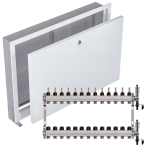 - Kompaktowe wymiary – rozdzielacz i szafka mają praktyczne wymiary, co ułatwia dopasowanie ich do różnych przestrzeni i instalacji.