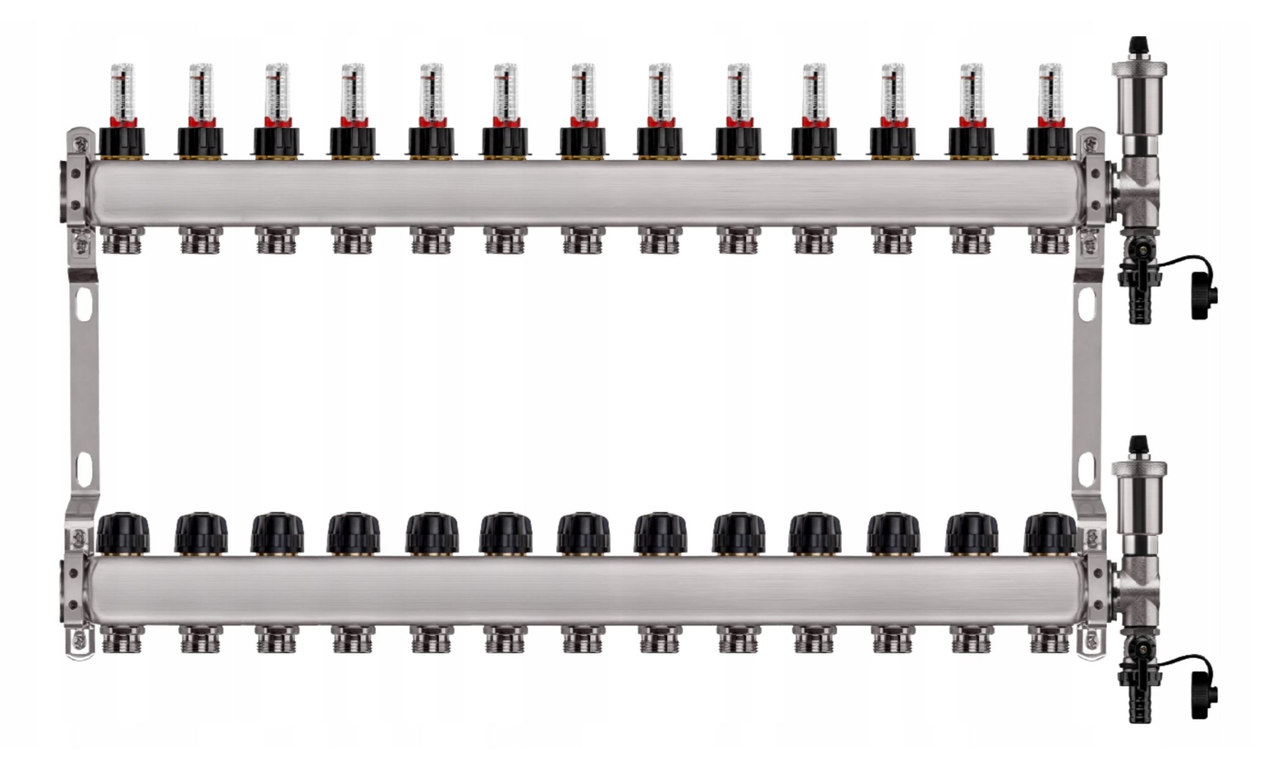 Zestaw wyposażony jest w przepływomierze (rotametry) z zaworami regulacyjnymi, które umożliwiają precyzyjną i szybką regulację przepływu dzięki skali umieszczonej na zaworze (do 5 l/min). Dodatkowo, w skład zestawu wchodzi zespół odpowietrzająco-spustowy z automatycznym odpowietrznikiem i systemem Aquastop, chroniący przed zalaniem. Zawór stopowy pozwala na łatwą wymianę i konserwację odpowietrznika bez konieczności opróżniania instalacji. Zawory termostatyczne z pokrętłami umożliwiają wyrównanie przepływu w pętlach o różnej długości oraz zrównoważenie instalacji pod względem oporów hydraulicznych. Wkładki termostatyczne są przystosowane do montażu siłowników elektrycznych M30x1,5, co pozwala na ręczną regulację przepływu lub całkowite zamknięcie wybranej pętli.