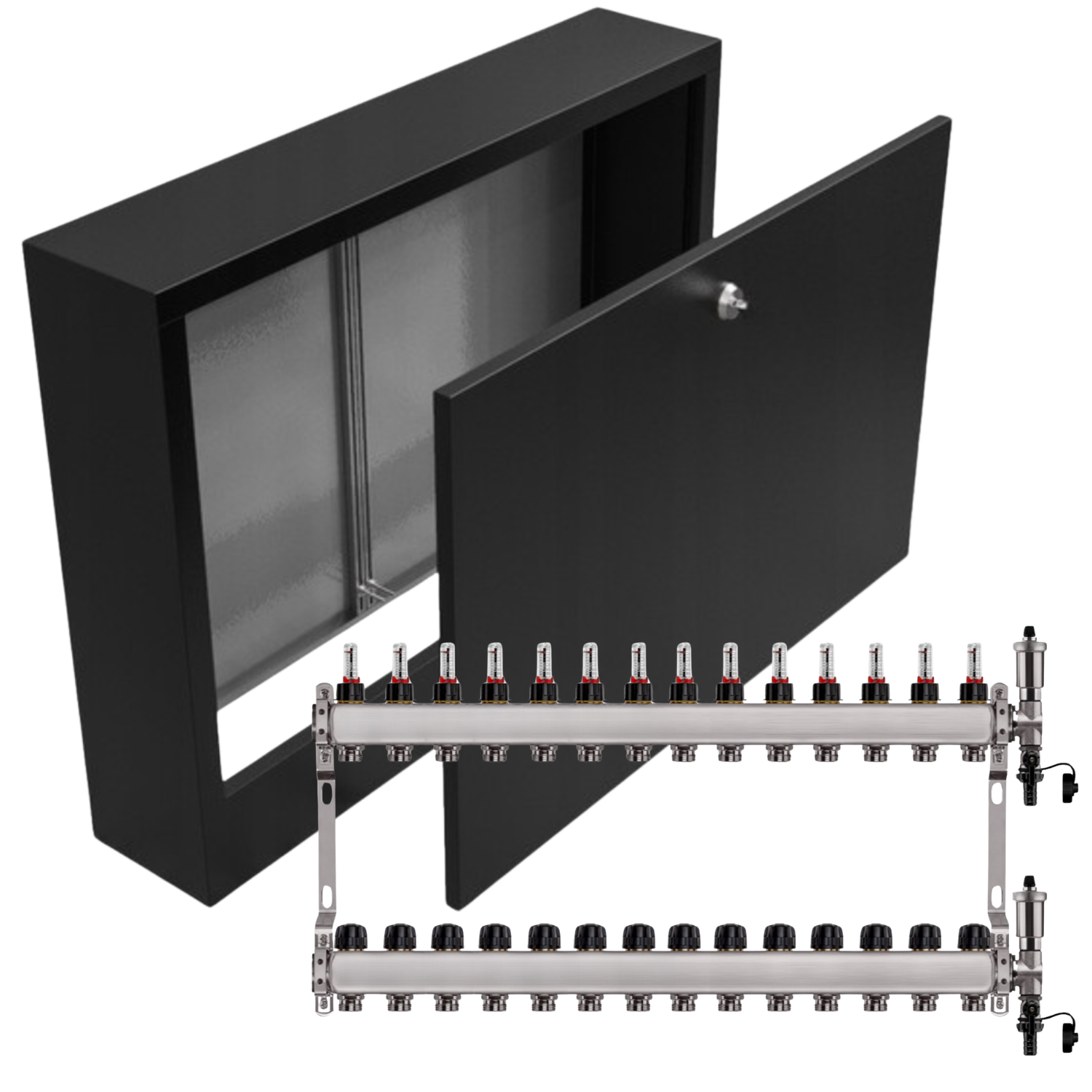 - Kompaktowe wymiary – rozdzielacz i szafka mają praktyczne wymiary, co ułatwia dopasowanie ich do różnych przestrzeni i instalacji.