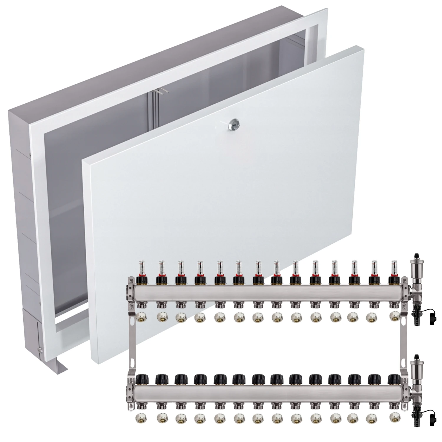 - Kompaktowe wymiary – rozdzielacz i szafka mają praktyczne wymiary, co ułatwia dopasowanie ich do różnych przestrzeni i instalacji.