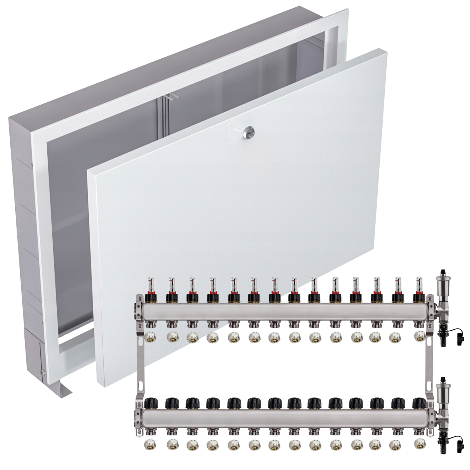 Zestaw wyposażony jest w przepływomierze (rotametry) z zaworami regulacyjnymi, które umożliwiają precyzyjną i szybką regulację przepływu dzięki skali umieszczonej na zaworze (do 5 l/min). Dodatkowo, w skład zestawu wchodzi zespół odpowietrzająco-spustowy z automatycznym odpowietrznikiem i systemem Aquastop, chroniący przed zalaniem. Zawór stopowy pozwala na łatwą wymianę i konserwację odpowietrznika bez konieczności opróżniania instalacji. Zawory termostatyczne z pokrętłami umożliwiają wyrównanie przepływu w pętlach o różnej długości oraz zrównoważenie instalacji pod względem oporów hydraulicznych. Wkładki termostatyczne są przystosowane do montażu siłowników elektrycznych M30x1,5, co pozwala na ręczną regulację przepływu lub całkowite zamknięcie wybranej pętli.