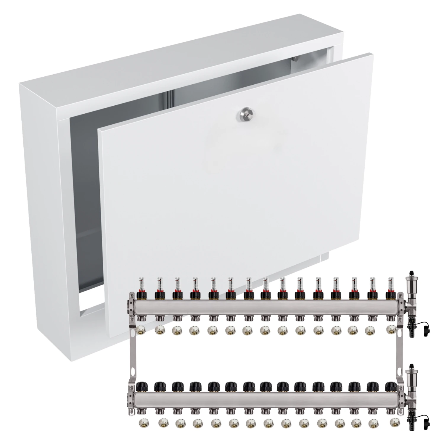 Zestaw wyposażony jest w przepływomierze (rotametry) z zaworami regulacyjnymi, które umożliwiają precyzyjną i szybką regulację przepływu dzięki skali umieszczonej na zaworze (do 5 l/min). Dodatkowo, w skład zestawu wchodzi zespół odpowietrzająco-spustowy z automatycznym odpowietrznikiem i systemem Aquastop, chroniący przed zalaniem. Zawór stopowy pozwala na łatwą wymianę i konserwację odpowietrznika bez konieczności opróżniania instalacji. Zawory termostatyczne z pokrętłami umożliwiają wyrównanie przepływu w pętlach o różnej długości oraz zrównoważenie instalacji pod względem oporów hydraulicznych. Wkładki termostatyczne są przystosowane do montażu siłowników elektrycznych M30x1,5, co pozwala na ręczną regulację przepływu lub całkowite zamknięcie wybranej pętli.