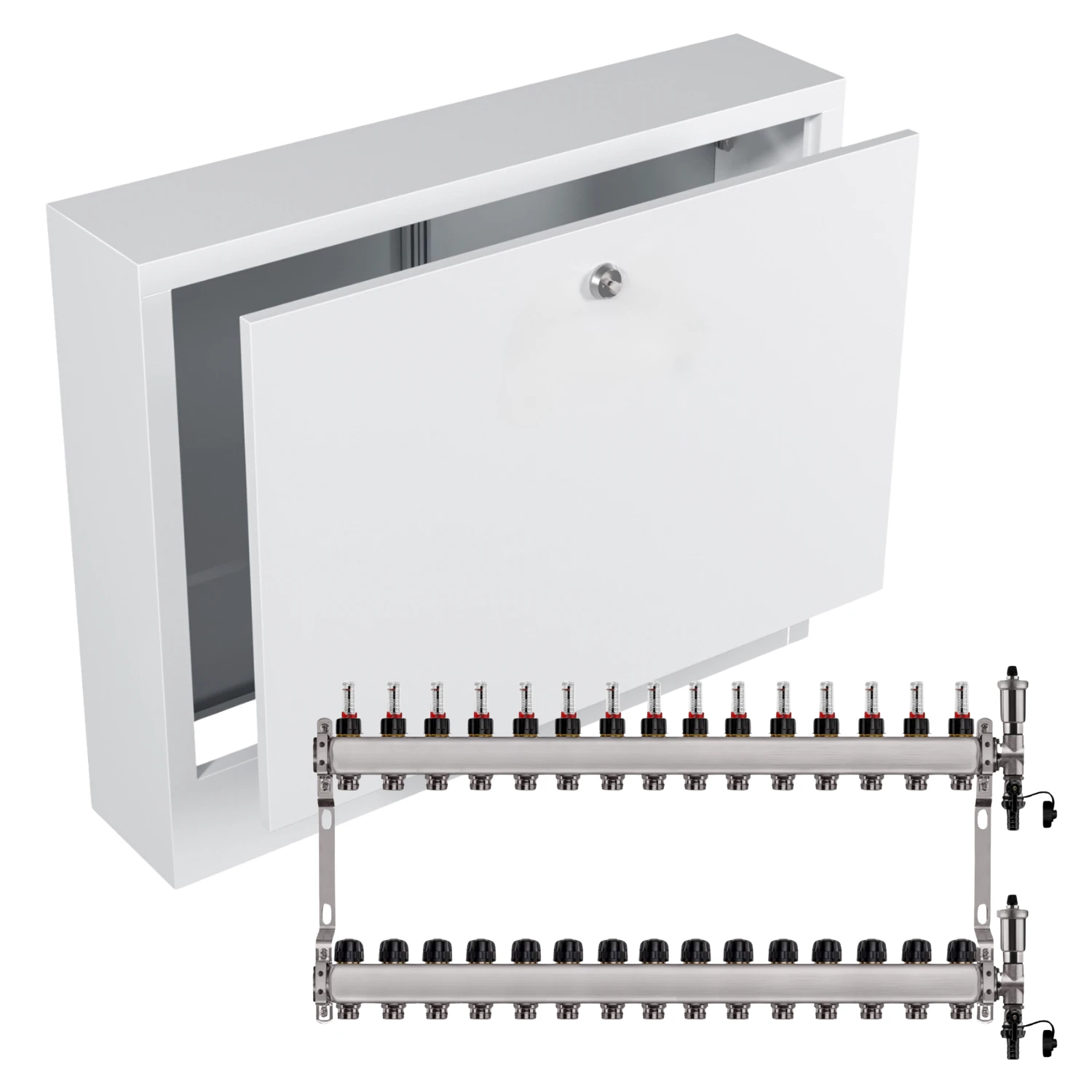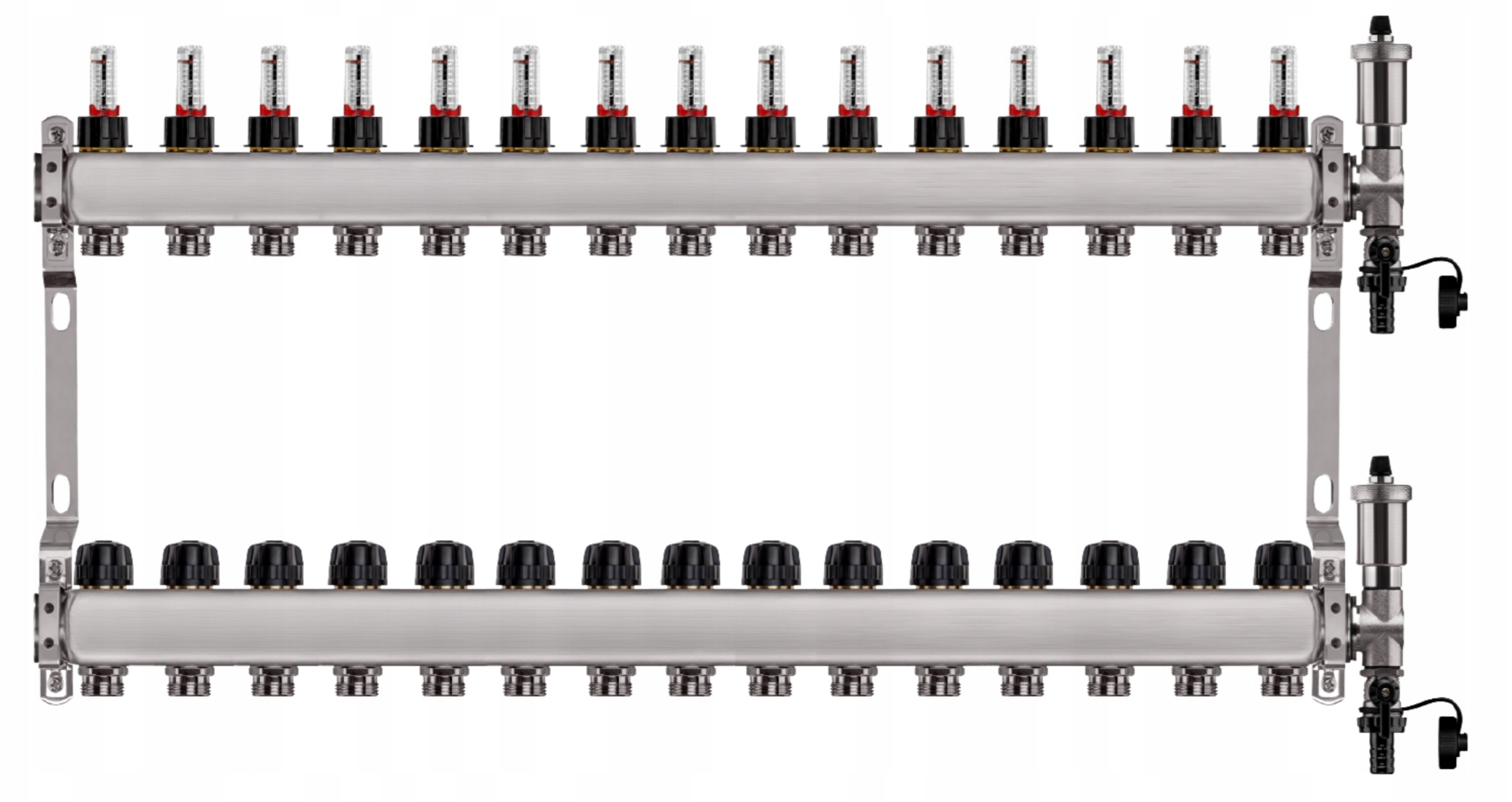 Zestaw wyposażony jest w przepływomierze (rotametry) z zaworami regulacyjnymi, które umożliwiają precyzyjną i szybką regulację przepływu dzięki skali umieszczonej na zaworze (do 5 l/min). Dodatkowo, w skład zestawu wchodzi zespół odpowietrzająco-spustowy z automatycznym odpowietrznikiem i systemem Aquastop, chroniący przed zalaniem. Zawór stopowy pozwala na łatwą wymianę i konserwację odpowietrznika bez konieczności opróżniania instalacji. Zawory termostatyczne z pokrętłami umożliwiają wyrównanie przepływu w pętlach o różnej długości oraz zrównoważenie instalacji pod względem oporów hydraulicznych. Wkładki termostatyczne są przystosowane do montażu siłowników elektrycznych M30x1,5, co pozwala na ręczną regulację przepływu lub całkowite zamknięcie wybranej pętli.
