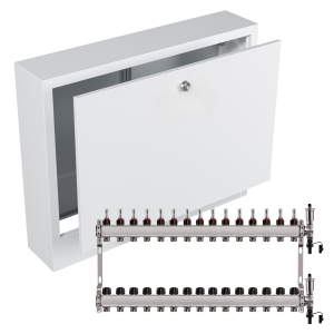 - Kompaktowe wymiary – rozdzielacz i szafka mają praktyczne wymiary, co ułatwia dopasowanie ich do różnych przestrzeni i instalacji.