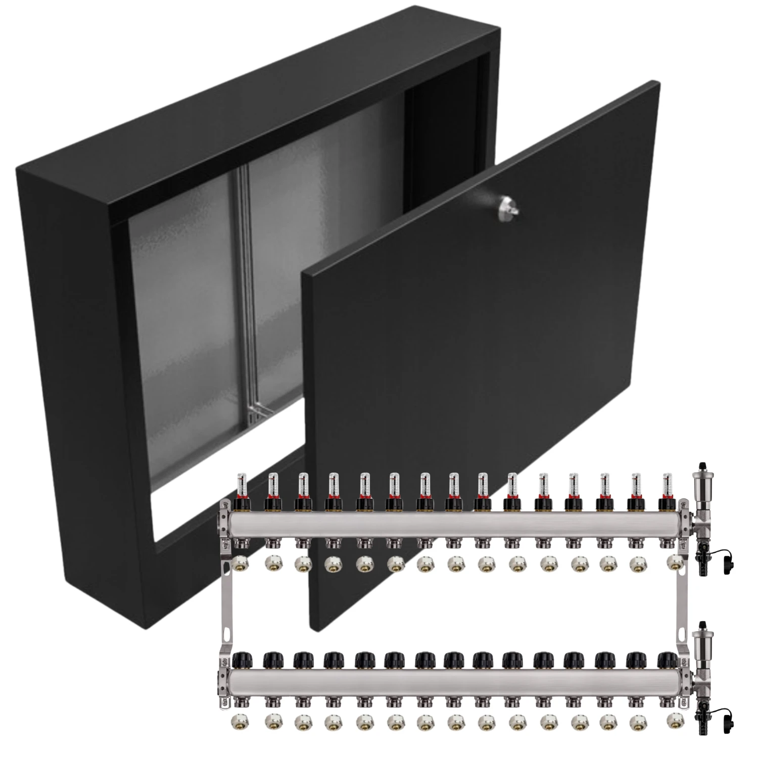 - Kompaktowe wymiary – rozdzielacz i szafka mają praktyczne wymiary, co ułatwia dopasowanie ich do różnych przestrzeni i instalacji.