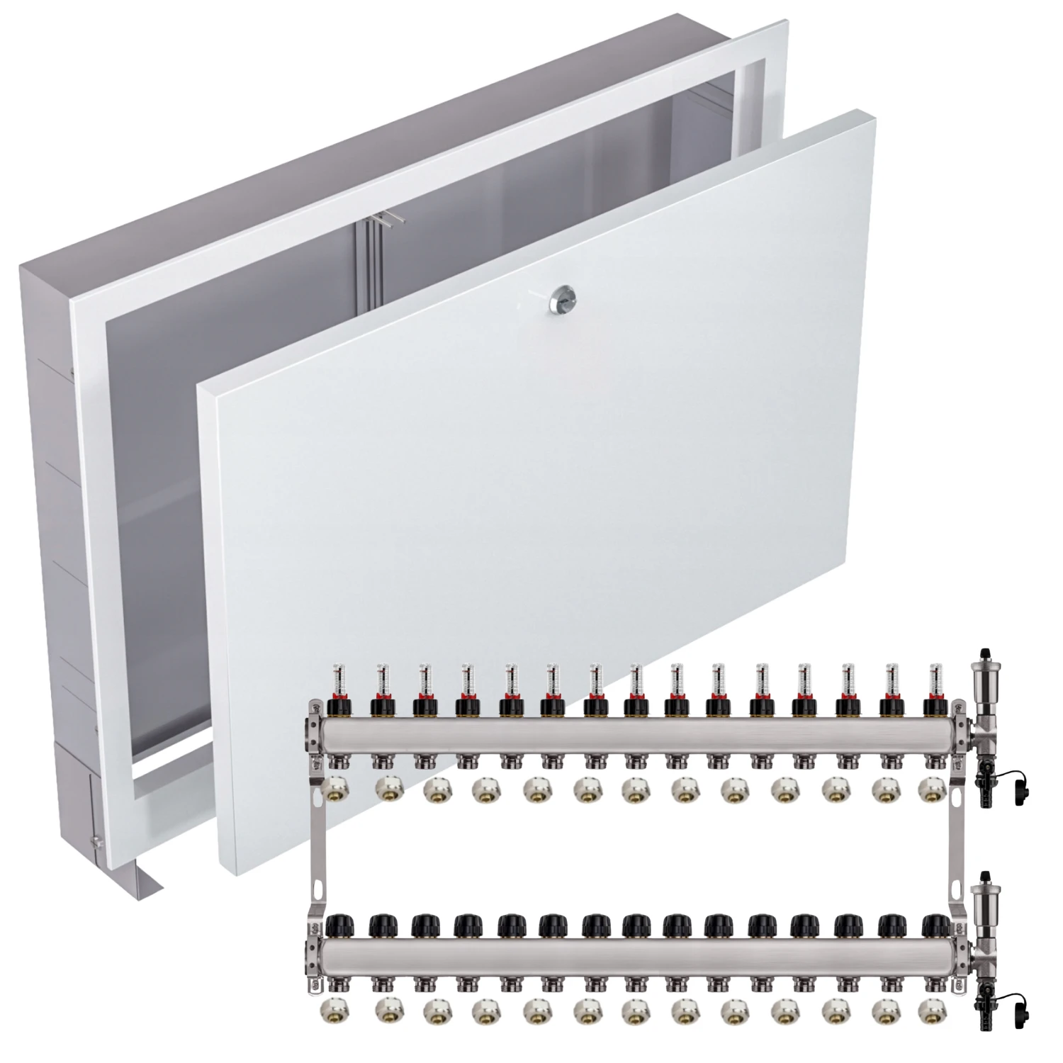 Zestaw wyposażony jest w przepływomierze (rotametry) z zaworami regulacyjnymi, które umożliwiają precyzyjną i szybką regulację przepływu dzięki skali umieszczonej na zaworze (do 5 l/min). Dodatkowo, w skład zestawu wchodzi zespół odpowietrzająco-spustowy z automatycznym odpowietrznikiem i systemem Aquastop, chroniący przed zalaniem. Zawór stopowy pozwala na łatwą wymianę i konserwację odpowietrznika bez konieczności opróżniania instalacji. Zawory termostatyczne z pokrętłami umożliwiają wyrównanie przepływu w pętlach o różnej długości oraz zrównoważenie instalacji pod względem oporów hydraulicznych. Wkładki termostatyczne są przystosowane do montażu siłowników elektrycznych M30x1,5, co pozwala na ręczną regulację przepływu lub całkowite zamknięcie wybranej pętli.