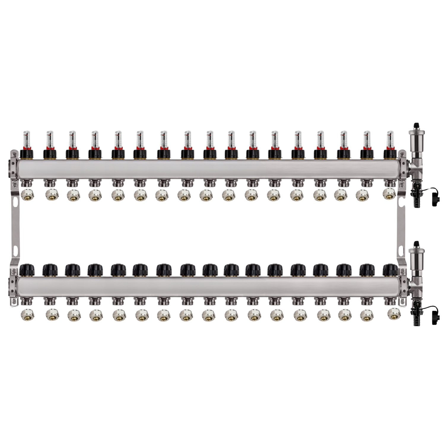 Zestaw wyposażony jest w przepływomierze (rotametry) z zaworami regulacyjnymi, które umożliwiają precyzyjną i szybką regulację przepływu dzięki skali umieszczonej na zaworze (do 5 l/min). Dodatkowo, w skład zestawu wchodzi zespół odpowietrzająco-spustowy z automatycznym odpowietrznikiem i systemem Aquastop, chroniący przed zalaniem. Zawór stopowy pozwala na łatwą wymianę i konserwację odpowietrznika bez konieczności opróżniania instalacji. Zawory termostatyczne z pokrętłami umożliwiają wyrównanie przepływu w pętlach o różnej długości oraz zrównoważenie instalacji pod względem oporów hydraulicznych. Wkładki termostatyczne są przystosowane do montażu siłowników elektrycznych M30x1,5, co pozwala na ręczną regulację przepływu lub całkowite zamknięcie wybranej pętli.