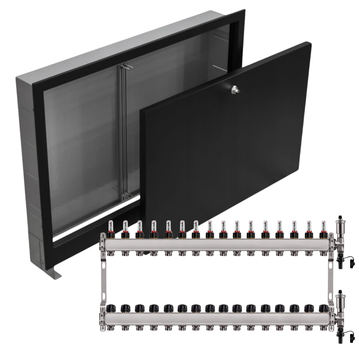 - Kompaktowe wymiary – rozdzielacz i szafka mają praktyczne wymiary, co ułatwia dopasowanie ich do różnych przestrzeni i instalacji.