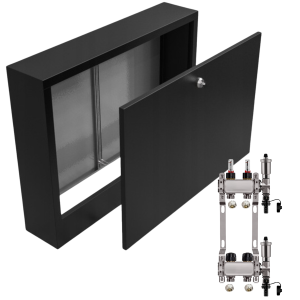 - Kompaktowe wymiary – rozdzielacz i szafka mają praktyczne wymiary, co ułatwia dopasowanie ich do różnych przestrzeni i instalacji.